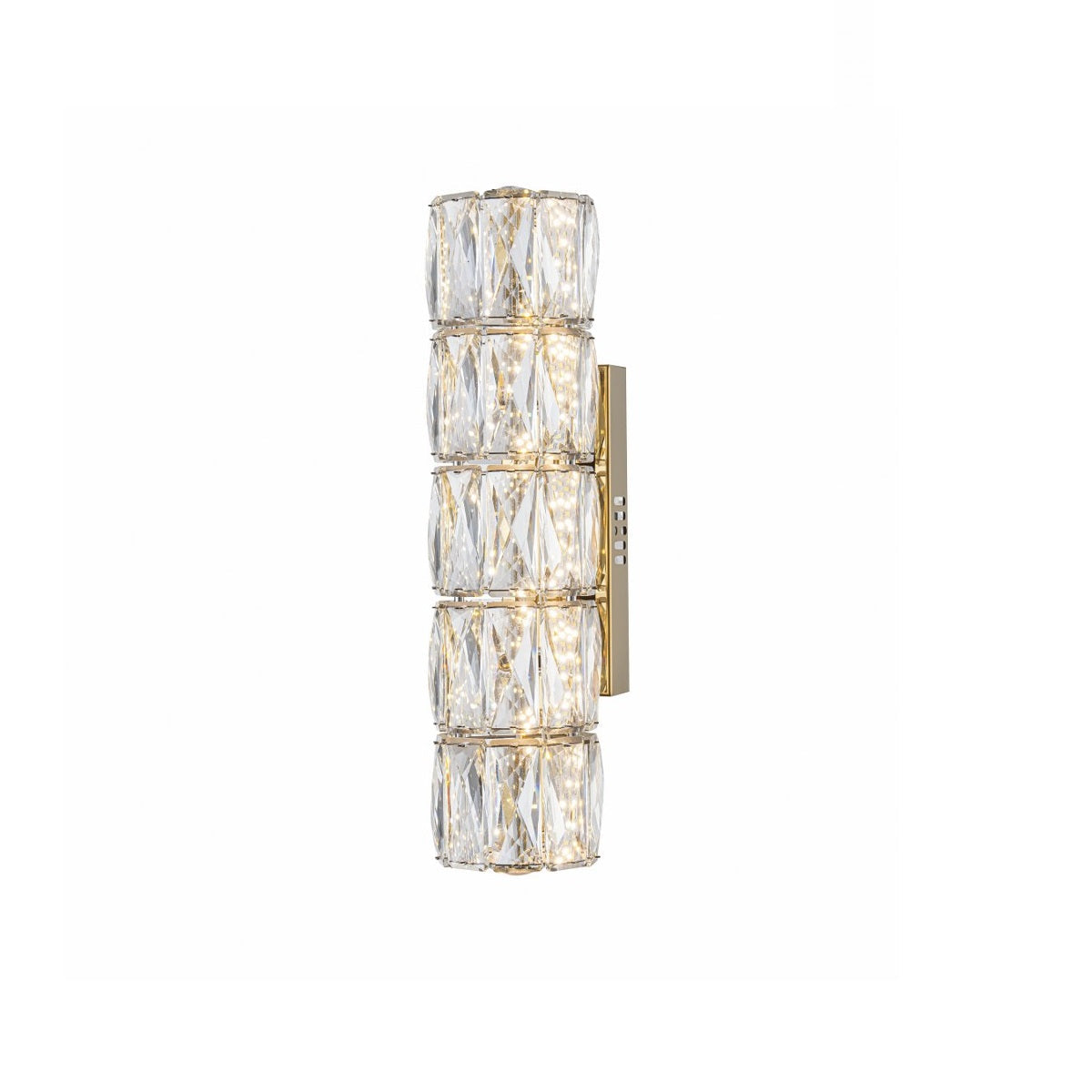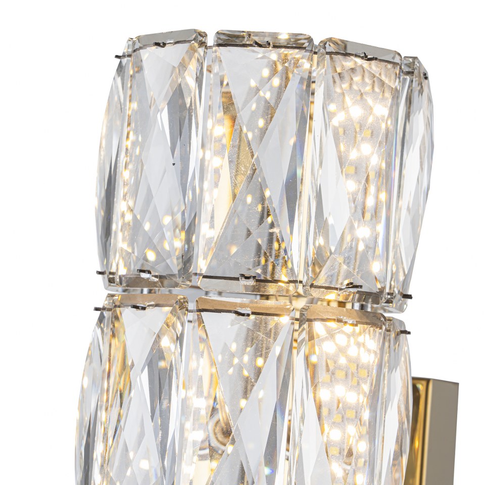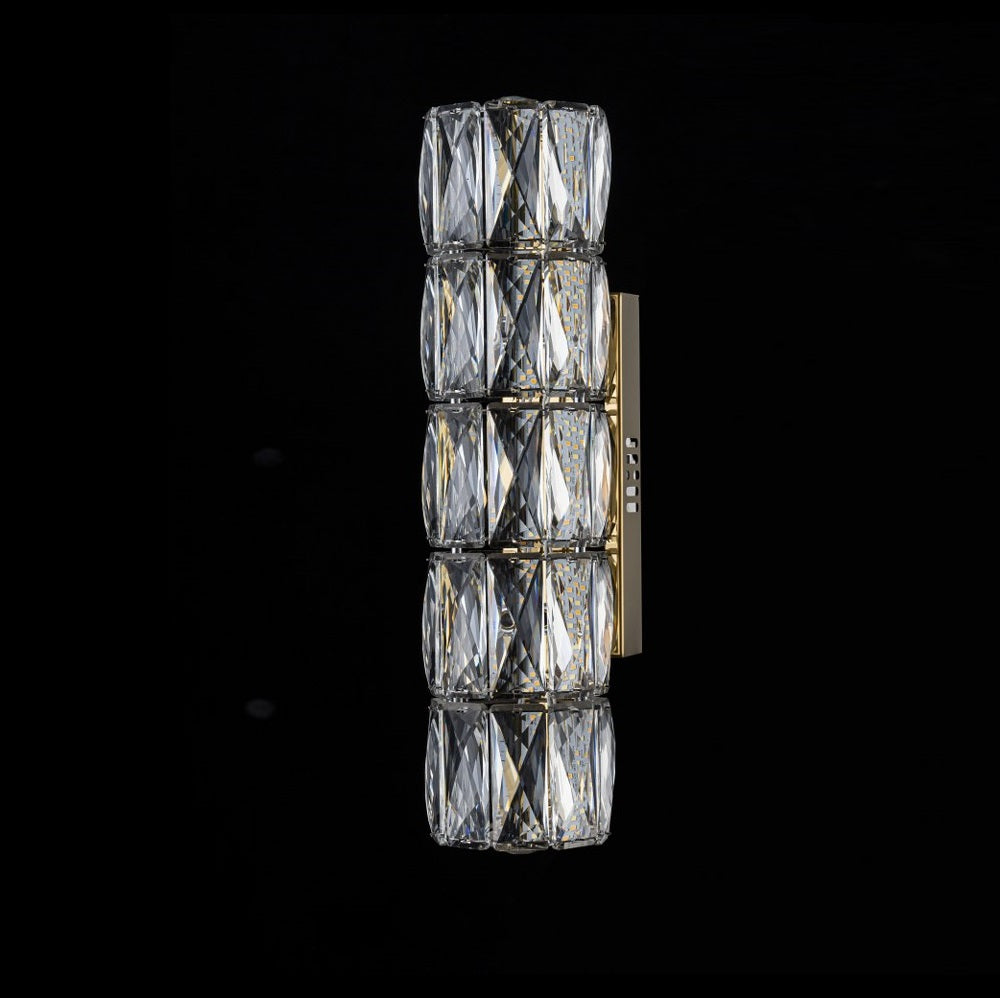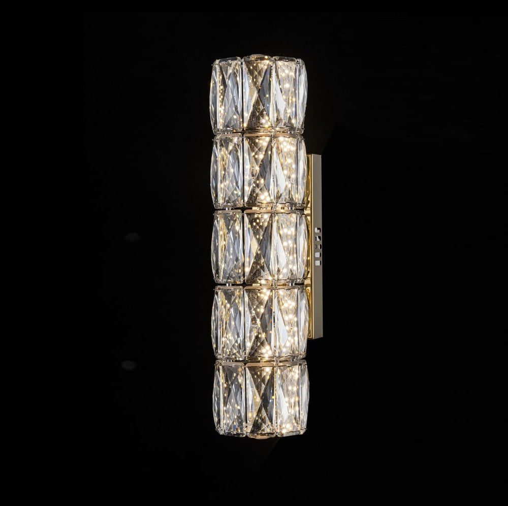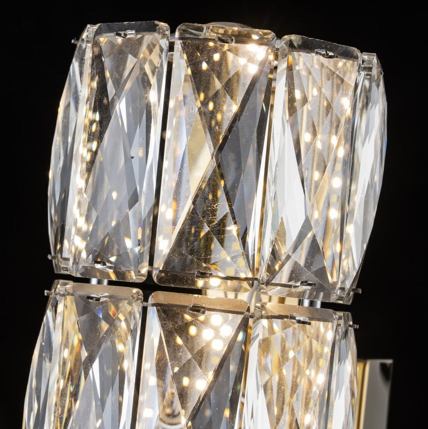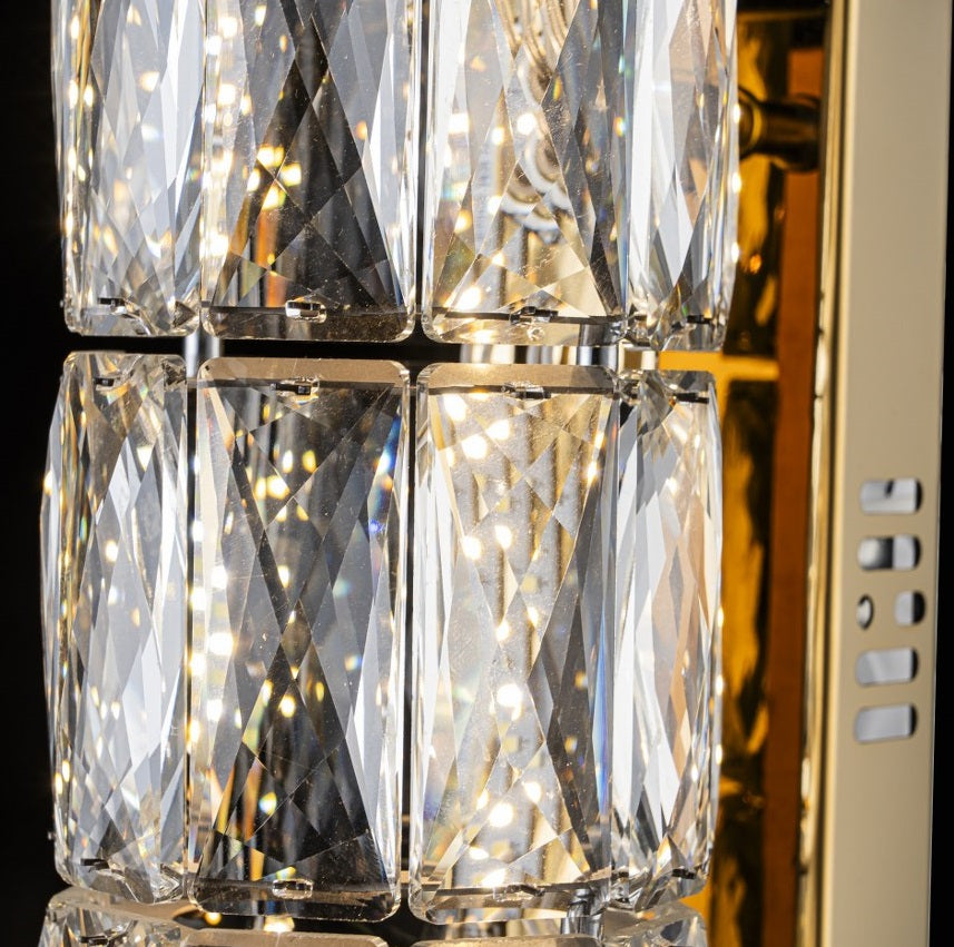 Este aplique cuenta con cristales de corte facetado tipo baguette, dispuestos en tres filas verticales. Su estructura de montaje resalta el brillo interno del LED CCT (3000K-6000K), proyectando reflejos elegantes y cálidos. Cada cristal está cuidadosamente montado para garantizar durabilidad y un efecto luminoso deslumbrante.
