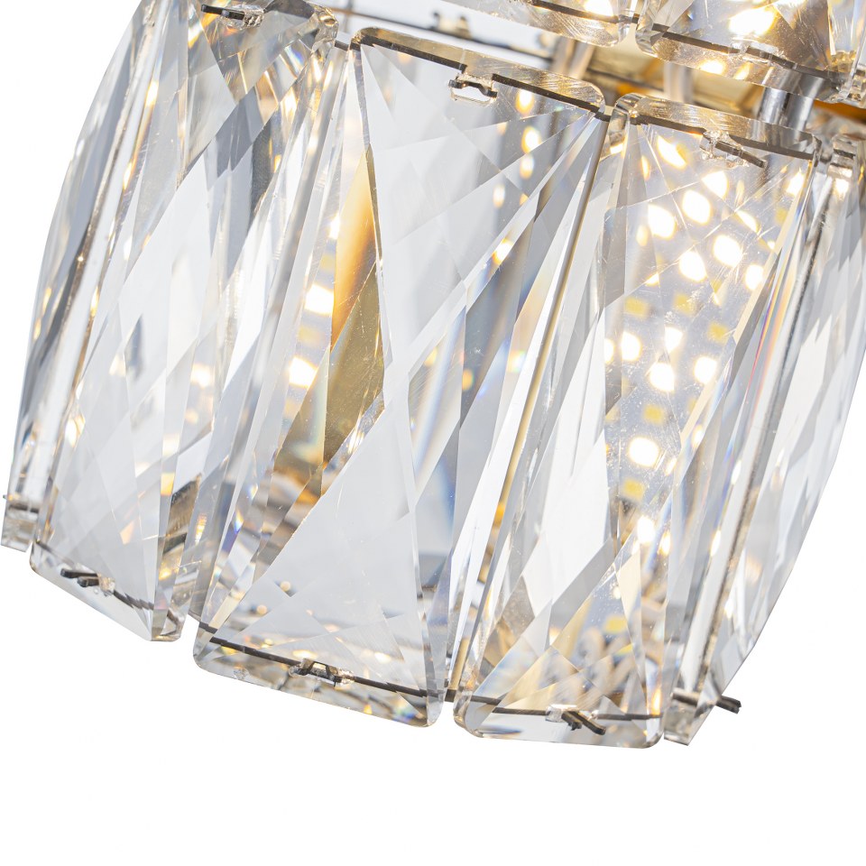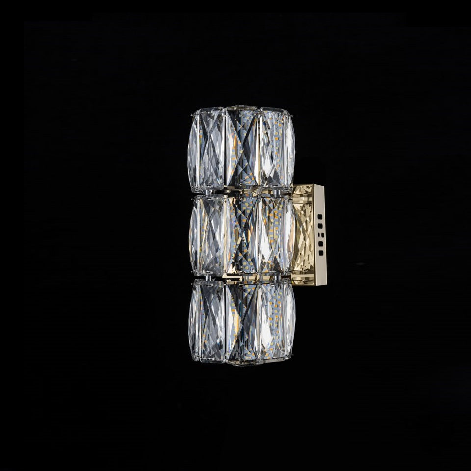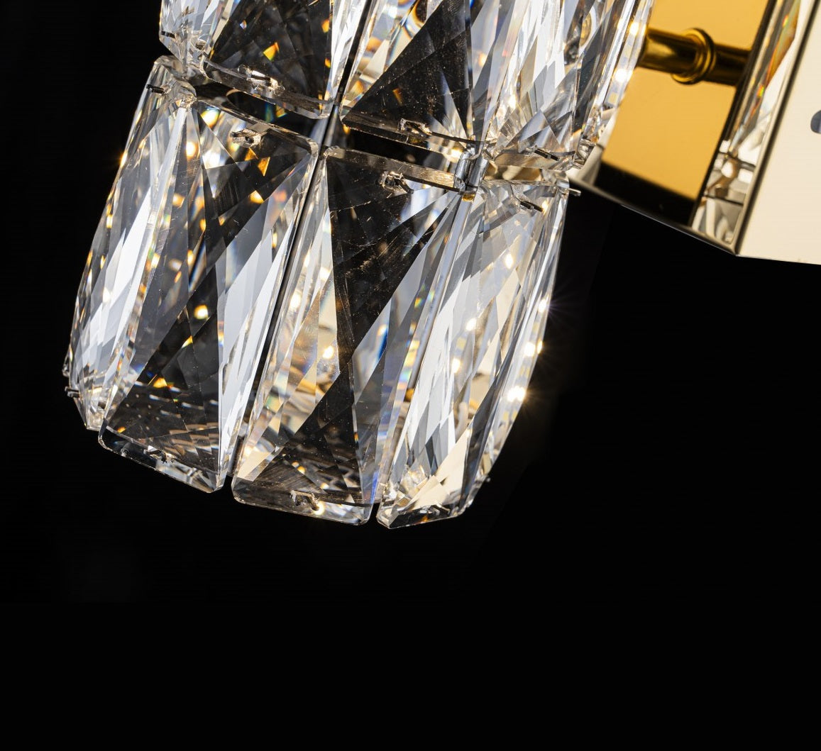El aplique LP122-1WS destaca por su uso de cristales tallados de alta transparencia, cuidadosamente biselados en formas geométricas que maximizan el brillo y los reflejos de luz. Cada pieza está pulida para ofrecer un efecto prismático que genera un juego visual elegante y sofisticado en la estancia.