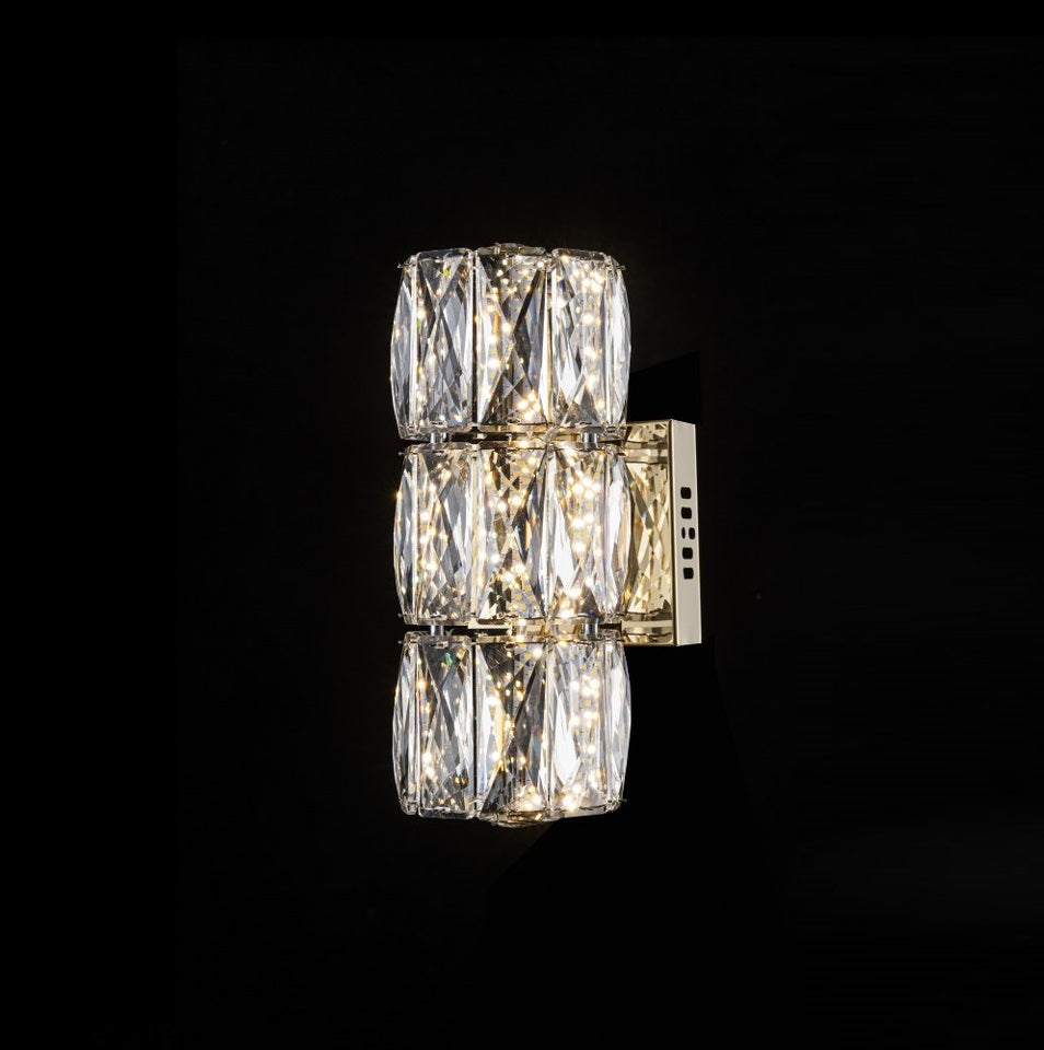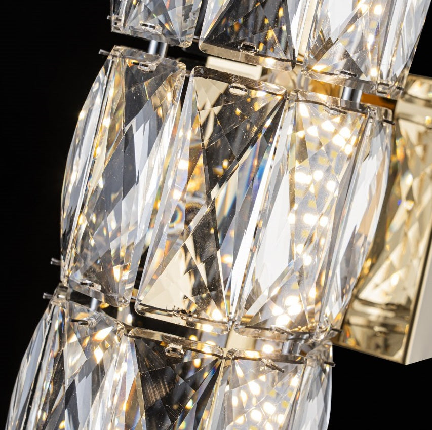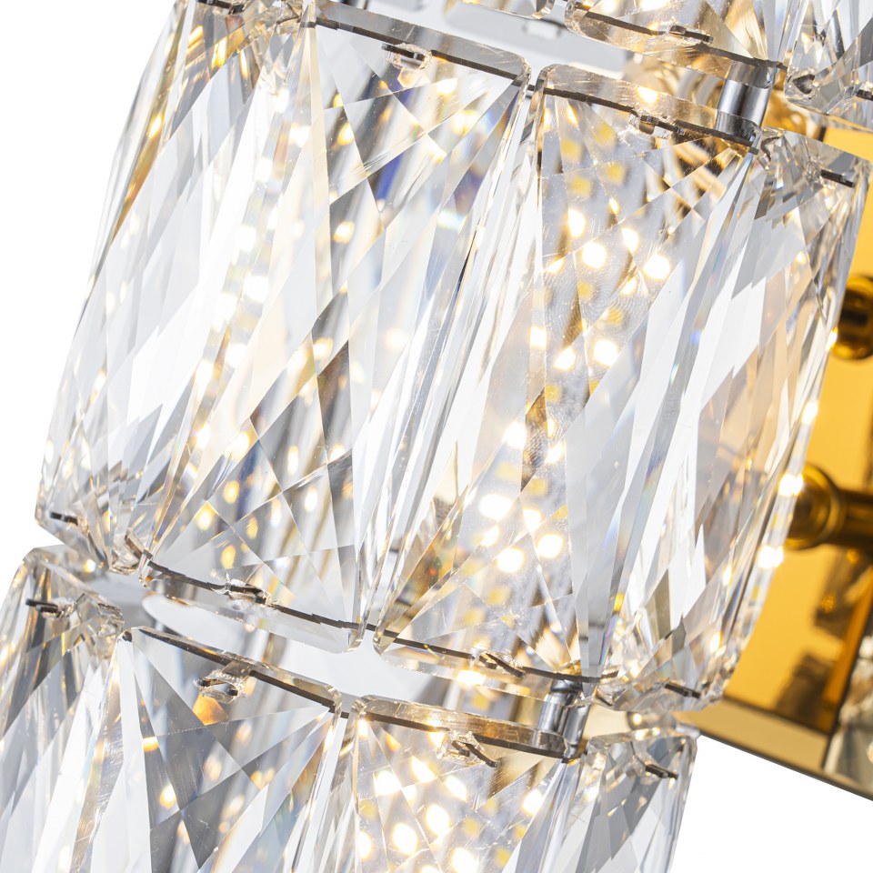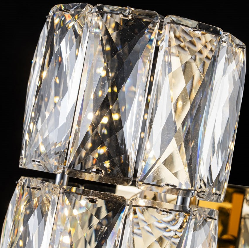 El aplique LP122-1WS destaca por su uso de cristales tallados de alta transparencia, cuidadosamente biselados en formas geométricas que maximizan el brillo y los reflejos de luz. Cada pieza está pulida para ofrecer un efecto prismático que genera un juego visual elegante y sofisticado en la estancia.