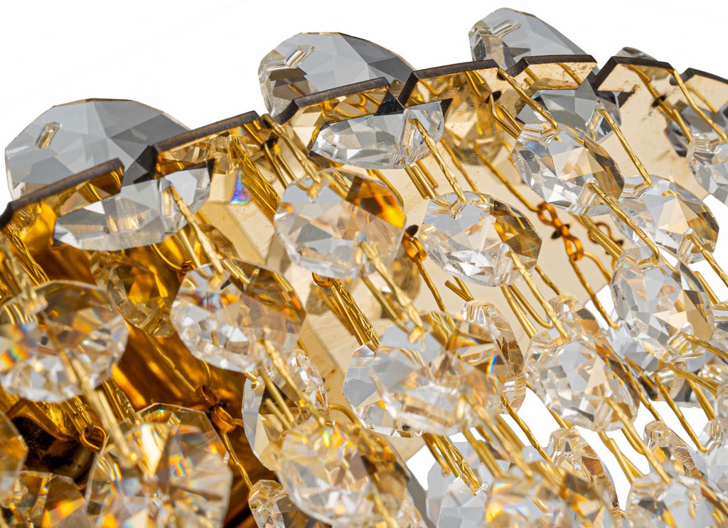 Aplique de pared con diseño de cascada de cristal, perfecto para añadir un toque de lujo y sofisticación a cualquier ambiente. Su estructura dorada con detalles en cristal aporta una iluminación cálida y elegante.