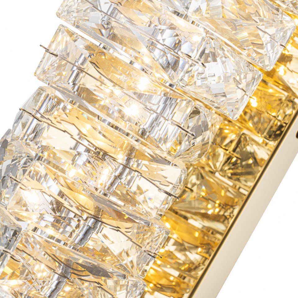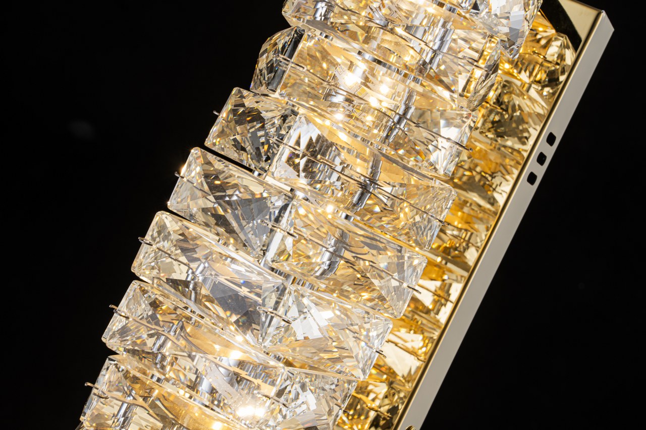 El cristal facetado se compone de módulos K9 que reflejan la luz con una tonalidad dorada envolvente. Cada bloque crea un efecto visual dinámico y elegante, con destellos que se multiplican sobre la superficie pulida del fondo metálico.