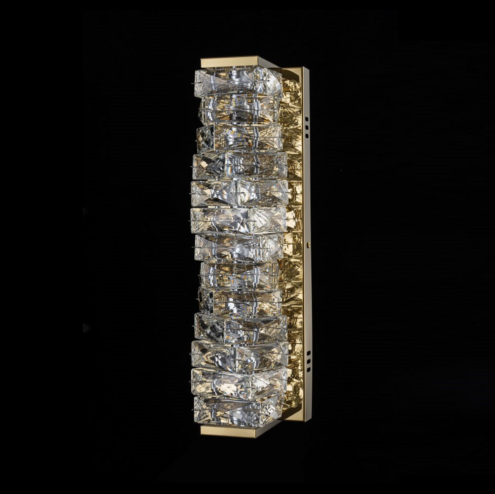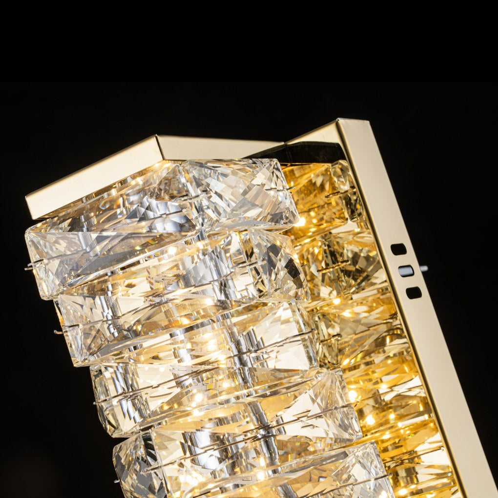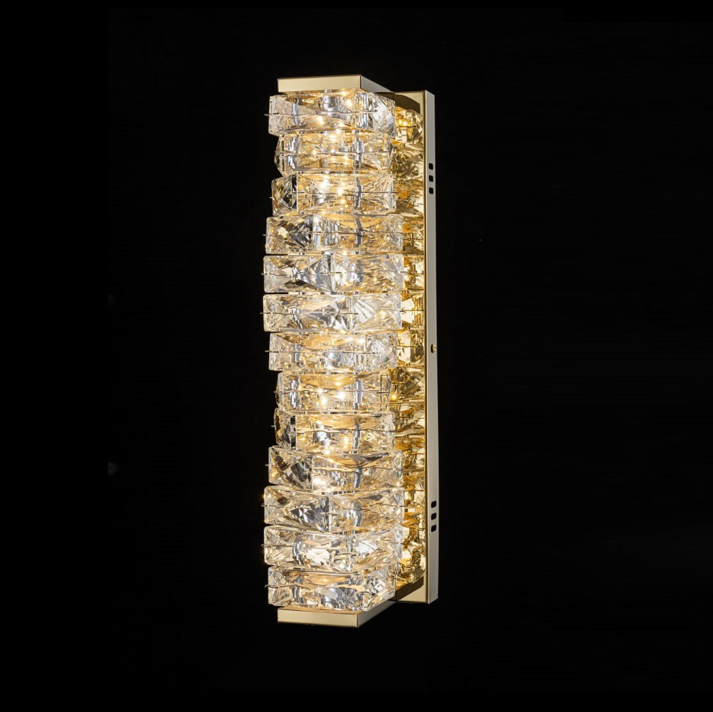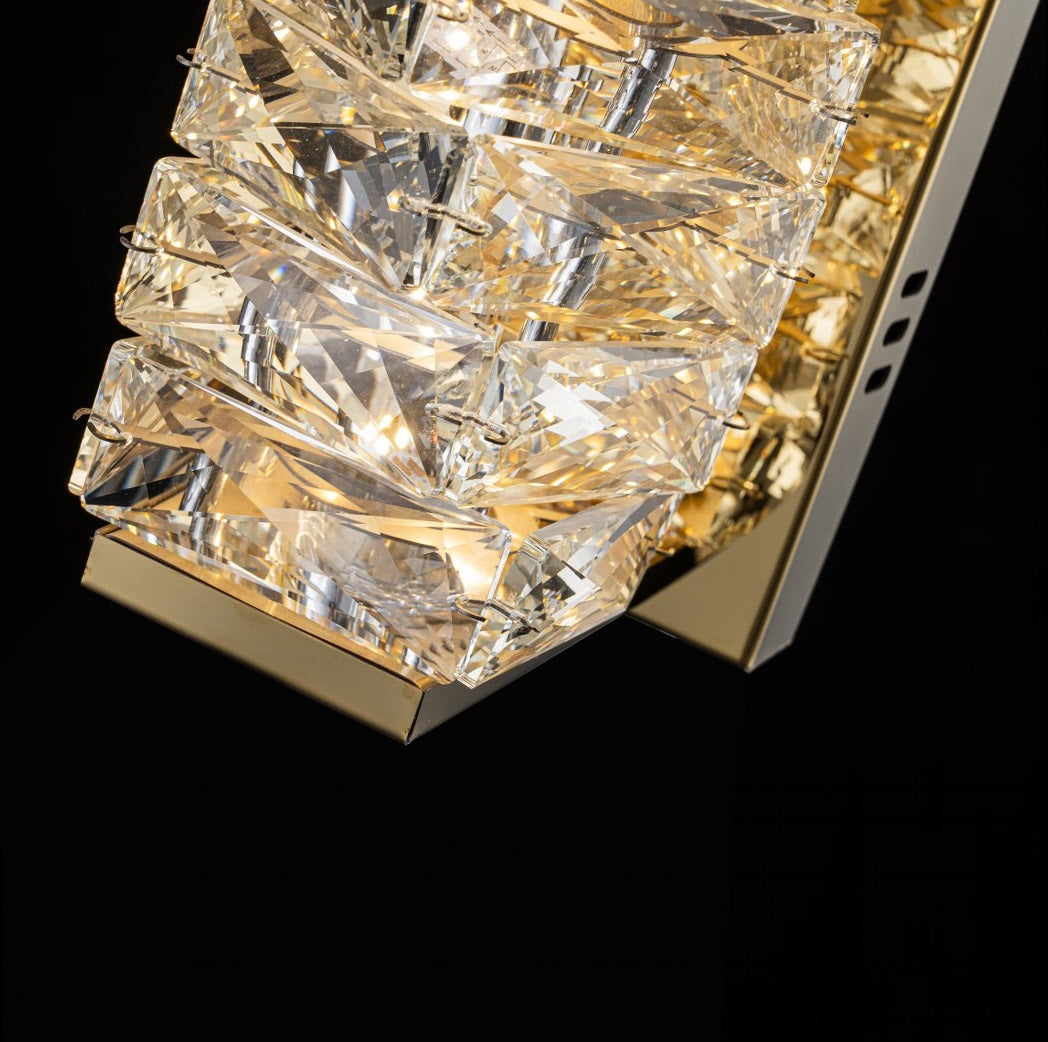 Esta lámpara de pared transforma cualquier rincón en una escena de elegancia atemporal. El cuerpo de cristal bañado en luz cálida se proyecta en la pared como una joya radiante, creando un juego de sombras y brillos que realzan el entorno con una atmósfera envolvente y refinada.