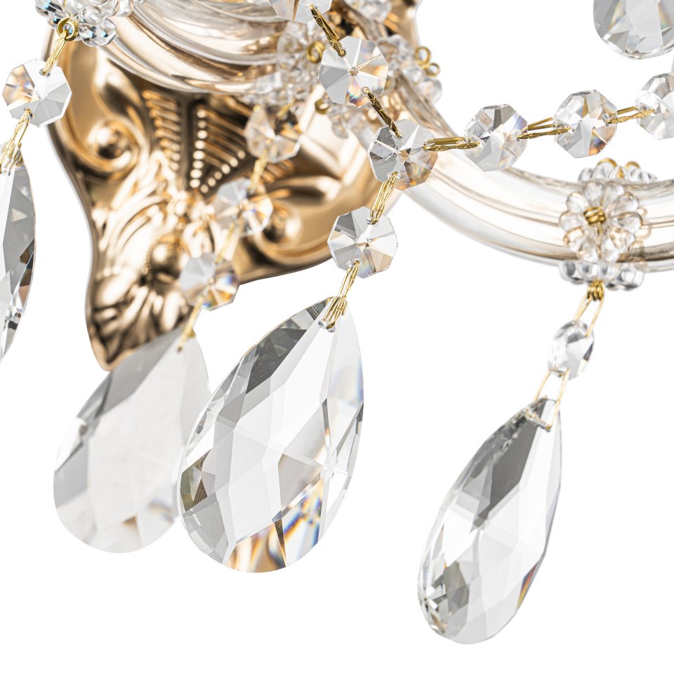 El cuerpo del aplique está fabricado en vidrio moldeado de alta calidad con acabado dorado brillante. Las estructuras metálicas están tratadas para garantizar una excelente resistencia al paso del tiempo, mientras que los detalles en forma de flor refuerzan su estética clásica.