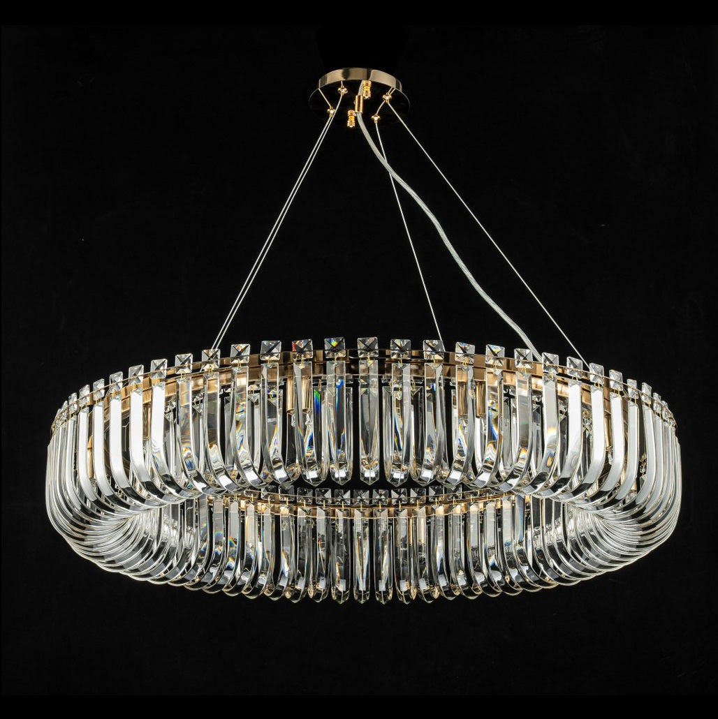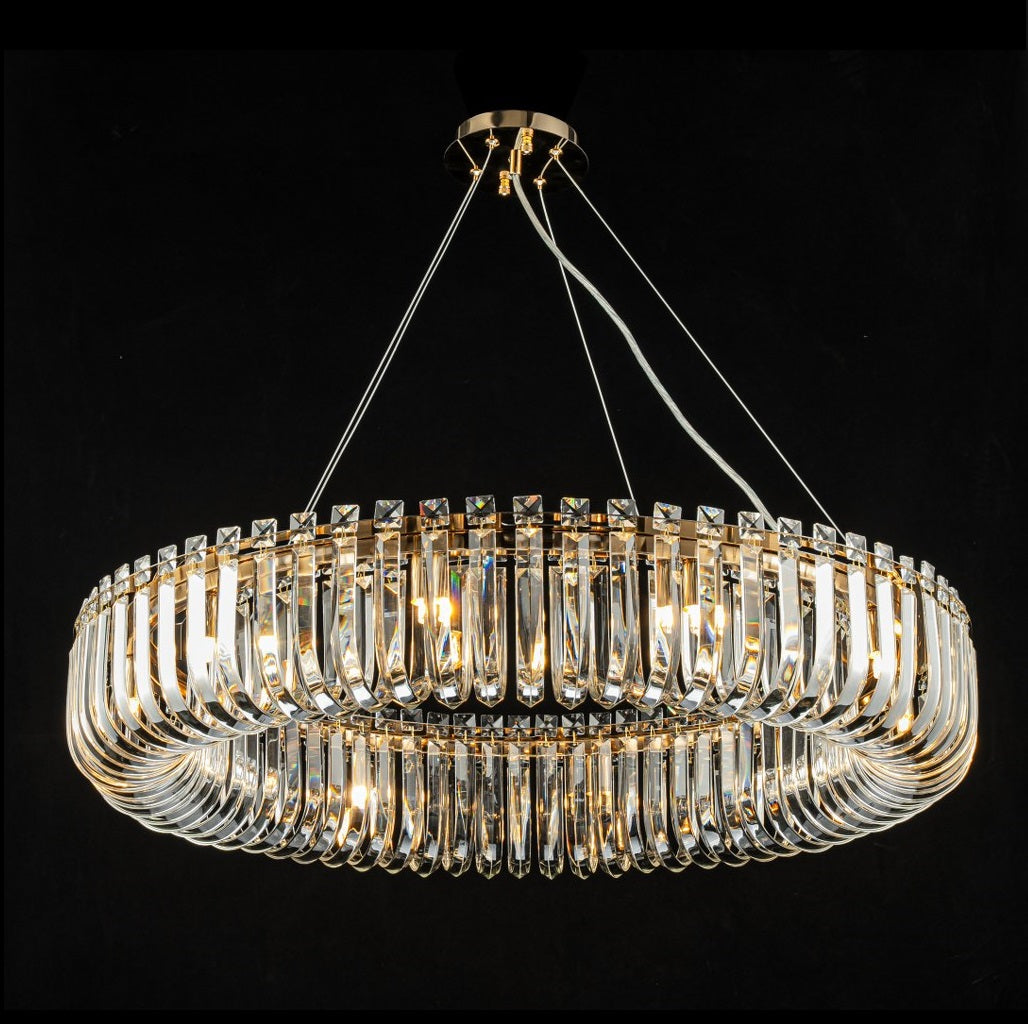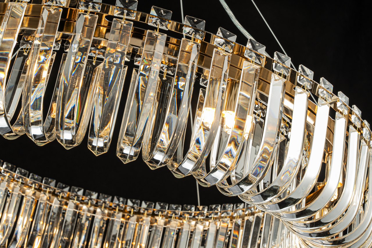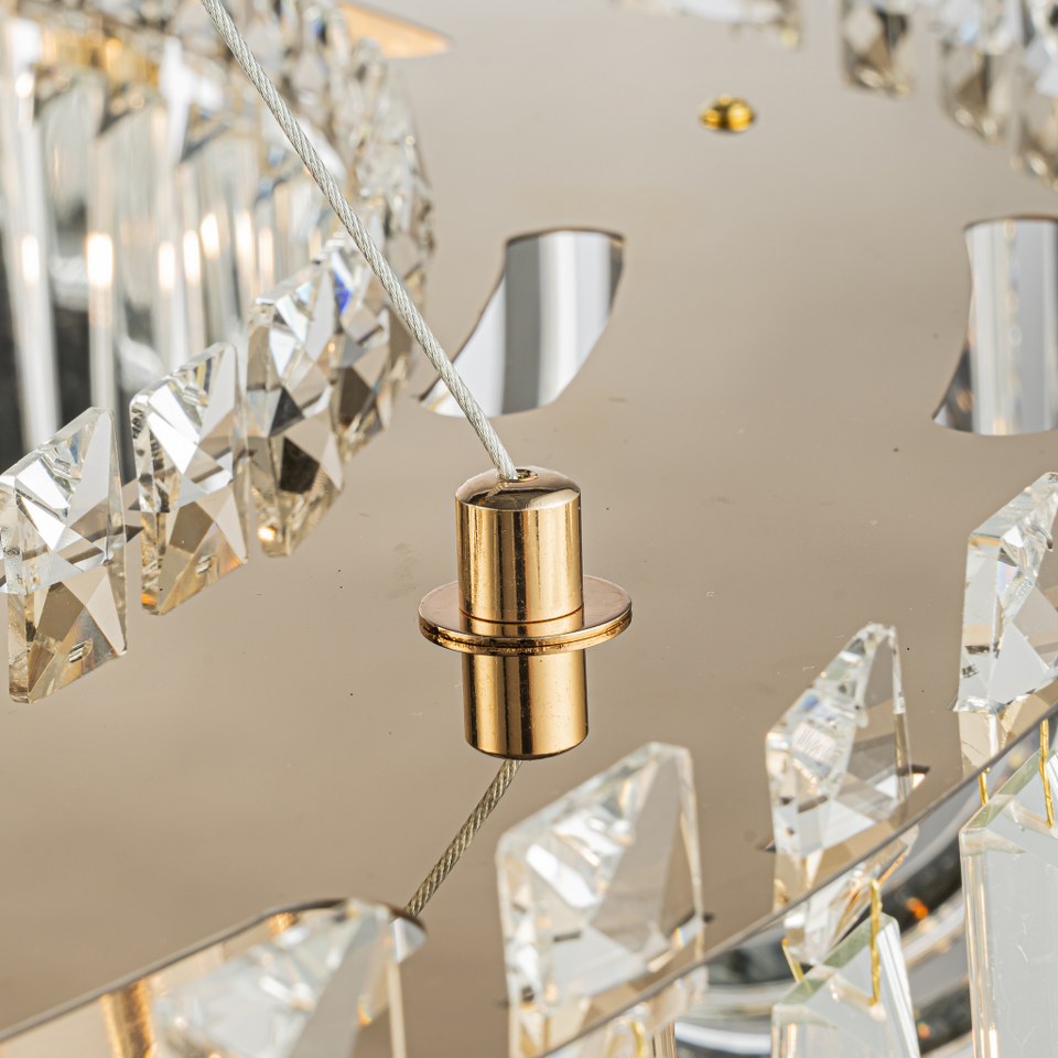 Cada pieza de esta lámpara está fabricada con cristal K9, reconocido por su transparencia, pureza y capacidad de reflejar la luz con una claridad excepcional. Este tipo de cristal se utiliza en iluminación de alta gama por su capacidad de crear destellos definidos, sin impurezas ni distorsiones.