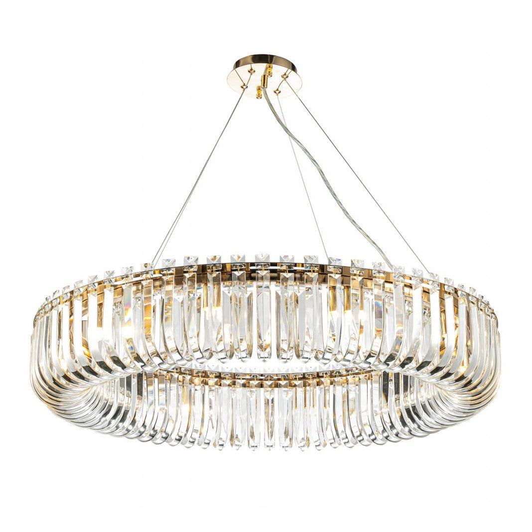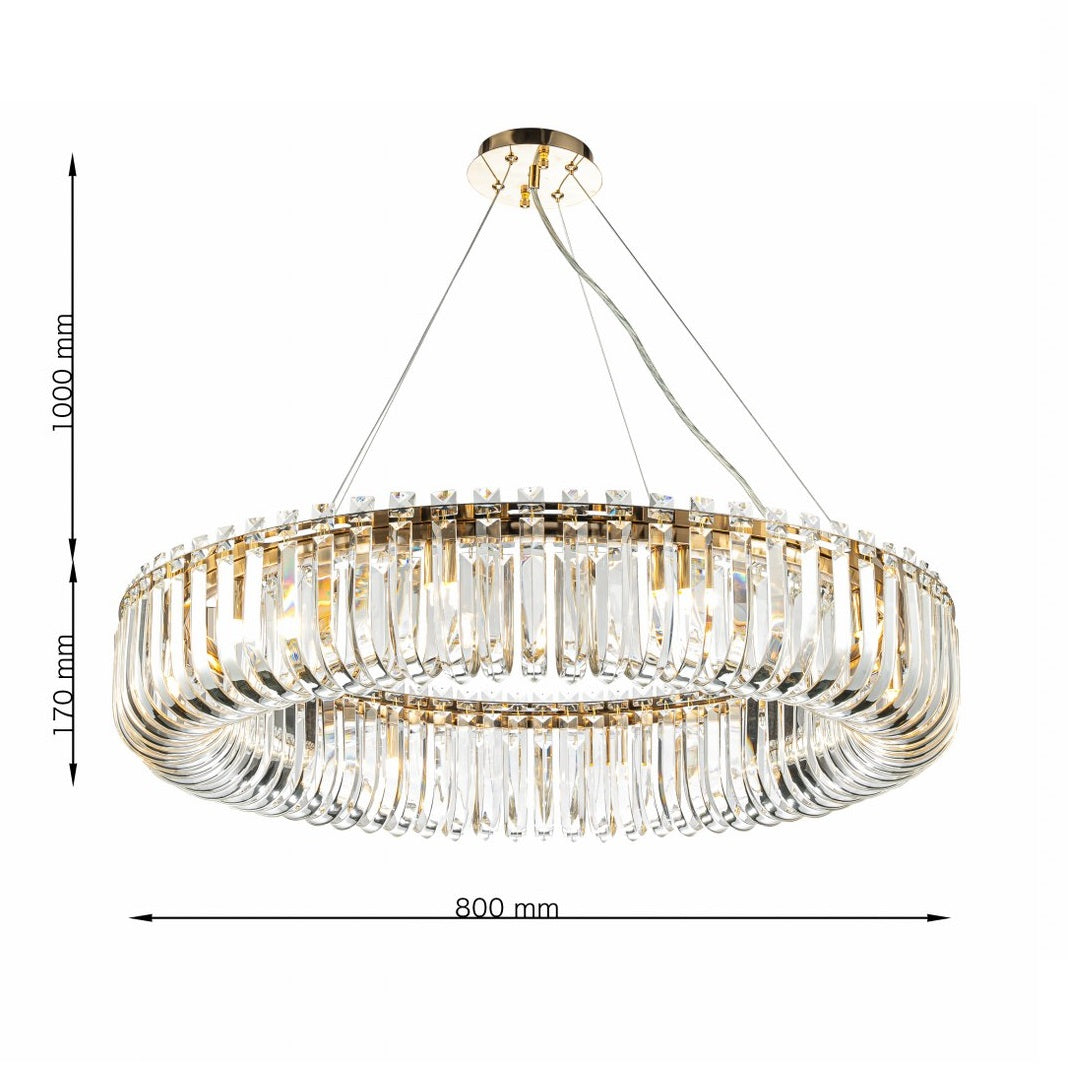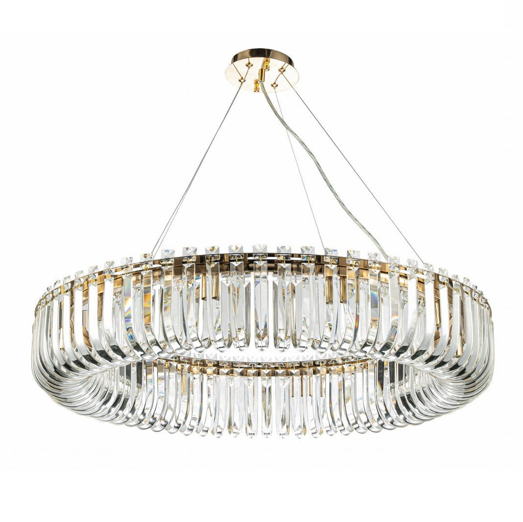 Lámpara colgante CLN132-D80P, con un diseño elegante en acabado dorado y cristales curvados. Perfecta para iluminar con estilo comedores, salas y espacios sofisticados.