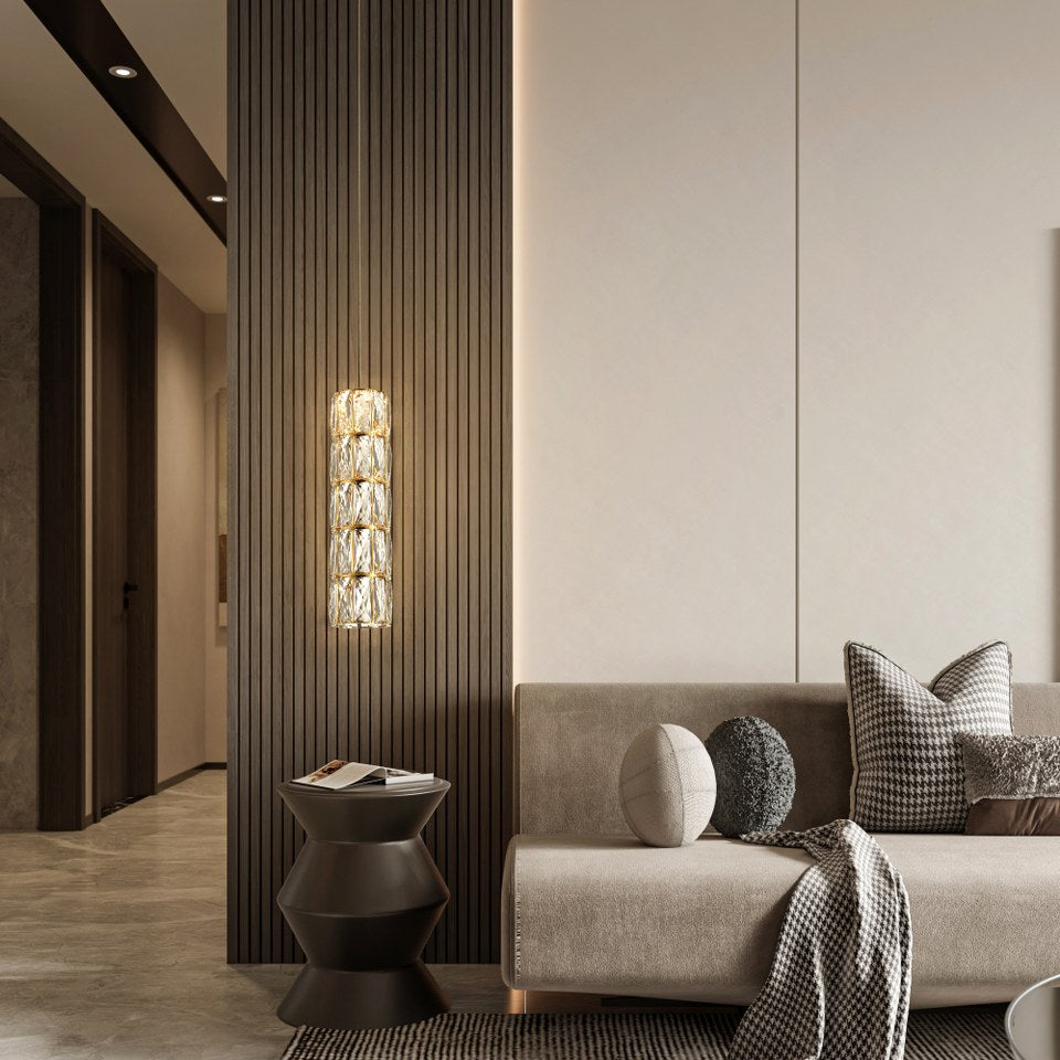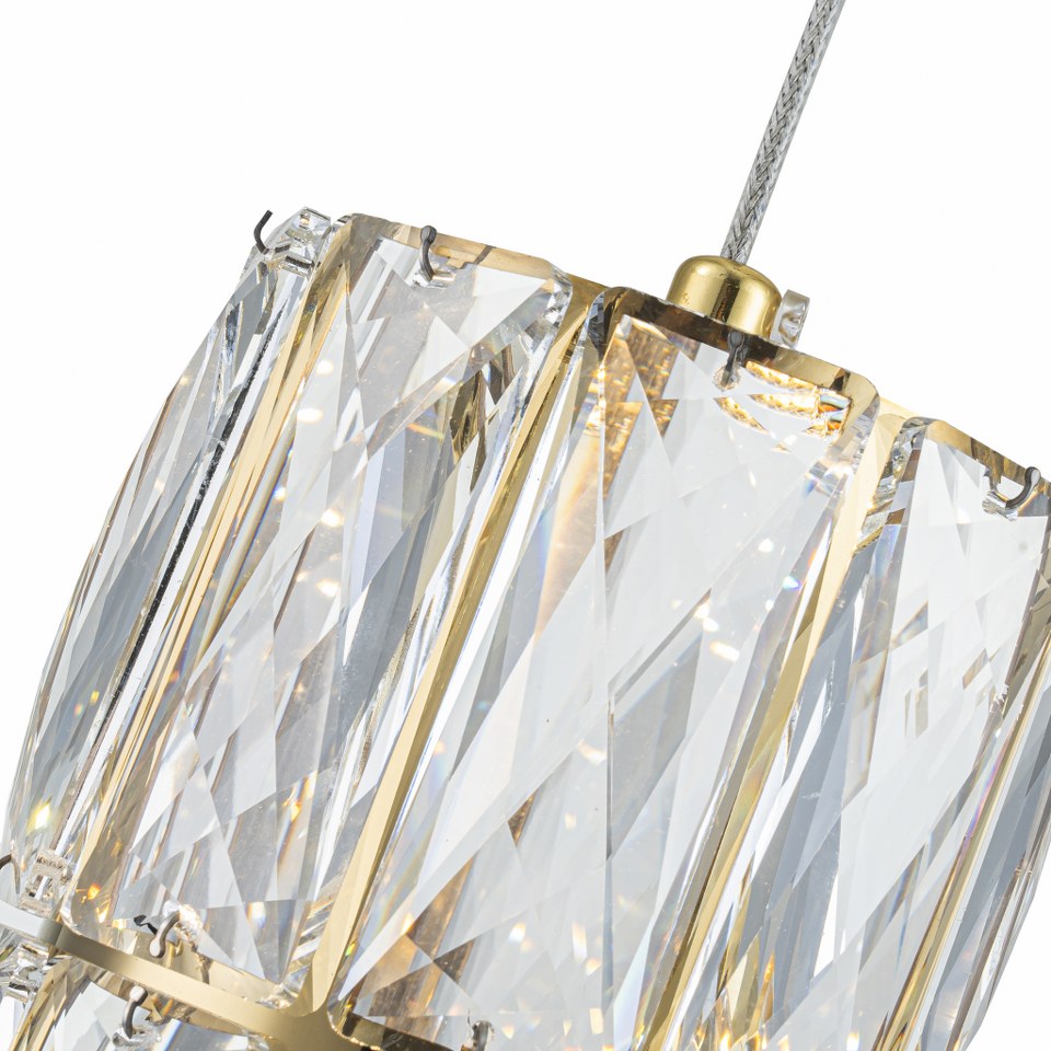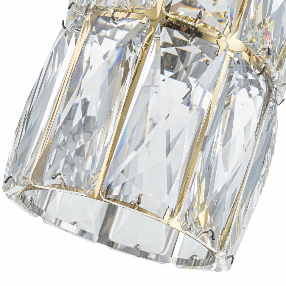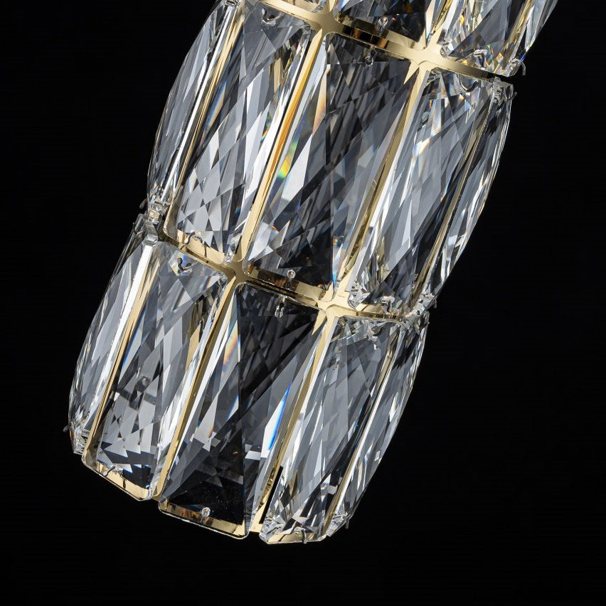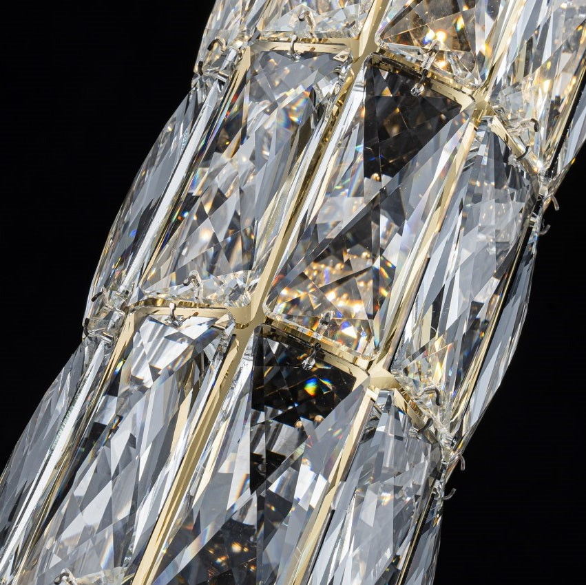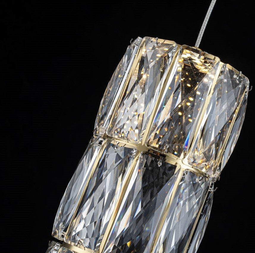 El primer plano revela la calidad del cristal K9, conocido por su alta transparencia y nitidez. Cada pieza está cuidadosamente tallada en forma de prisma facetado, creando un juego de luces que aporta dinamismo y lujo al ambiente.