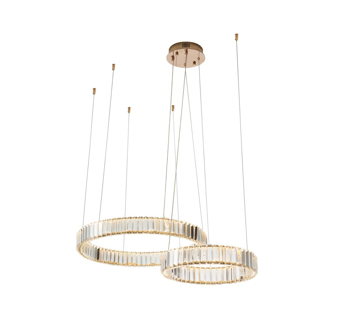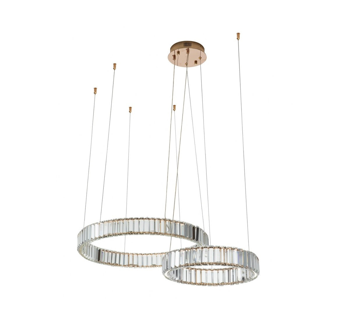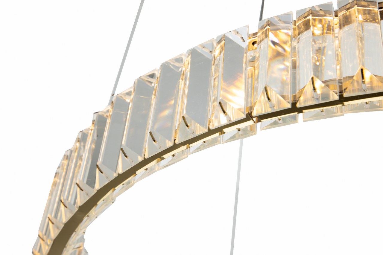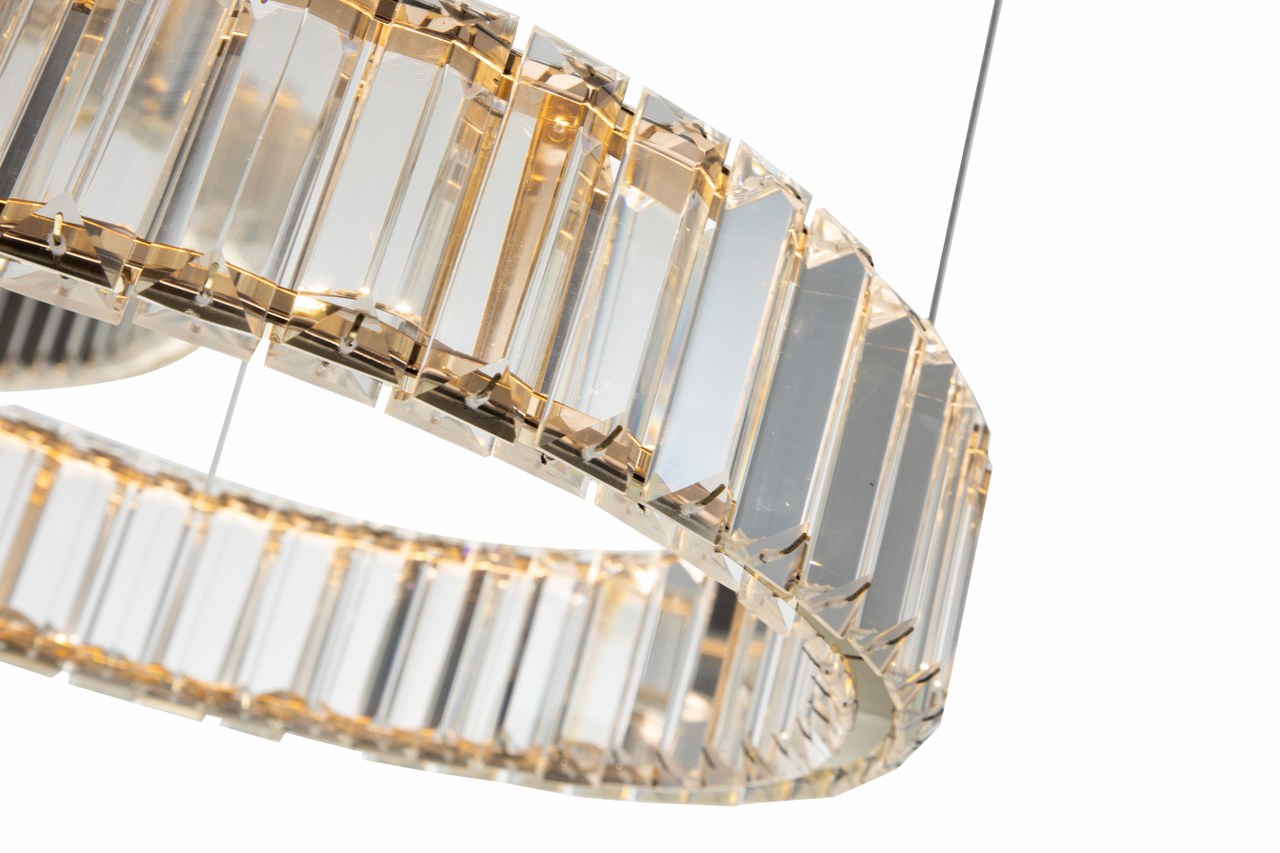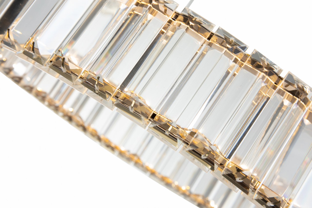 Cada aro está envuelto en elegantes piezas de cristal tallado que capturan y reflejan la luz con un brillo sofisticado. Este diseño facetado no solo genera un efecto visual cautivador desde todos los ángulos, sino que aporta una sensación de lujo silencioso que transforma cualquier ambiente.