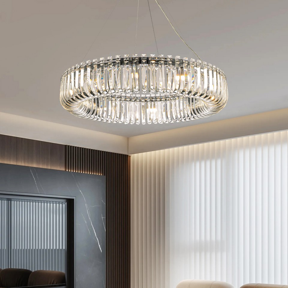 El modelo CLN131-D80P se instala con suspensión regulable, creando un efecto flotante que realza la elegancia del espacio sin sobrecargarlo. Su estructura circular y acabados cromados combinan perfectamente con interiores contemporáneos, aportando luz cálida y un toque de diseño de alto nivel.