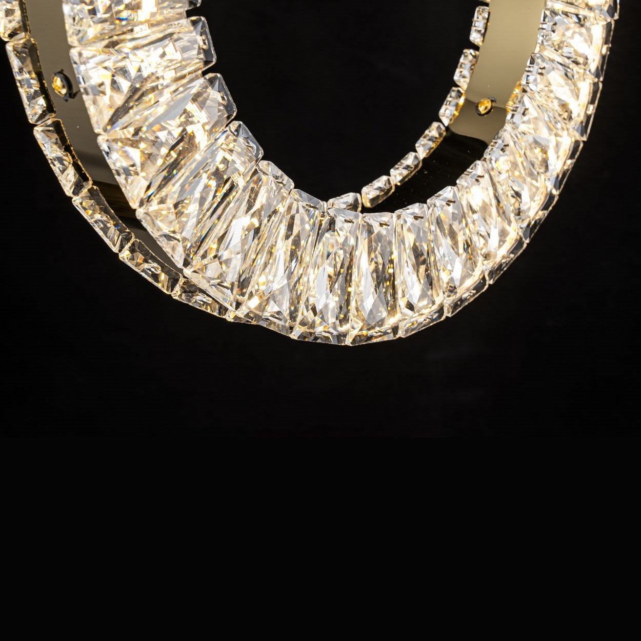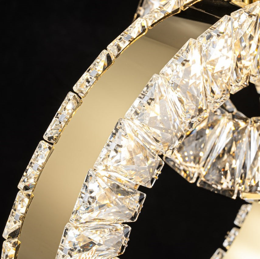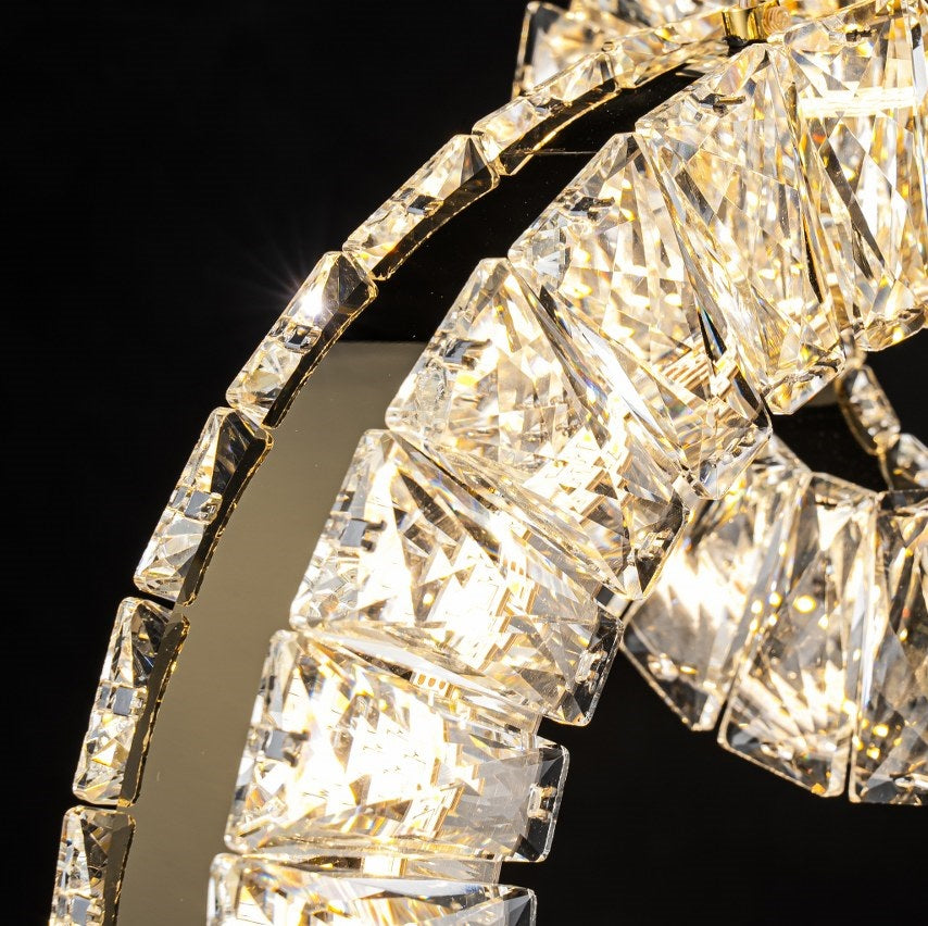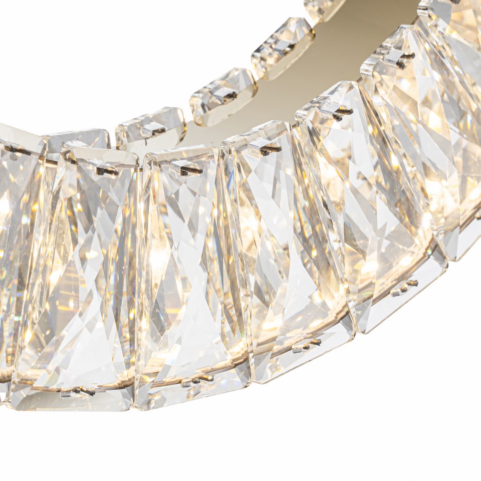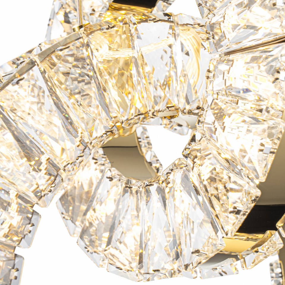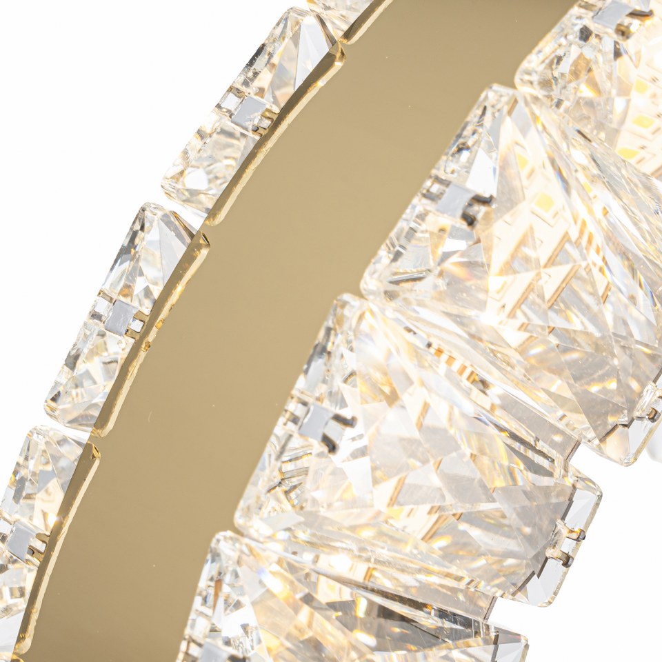 La lámpara incorpora cristales tallados de alta transparencia que capturan y dispersan la luz con un efecto deslumbrante. Cada pieza refleja tonalidades cálidas y destellos brillantes que aportan un aire sofisticado y acogedor al espacio. Perfecta para quienes buscan un toque de lujo sutil pero impactante.