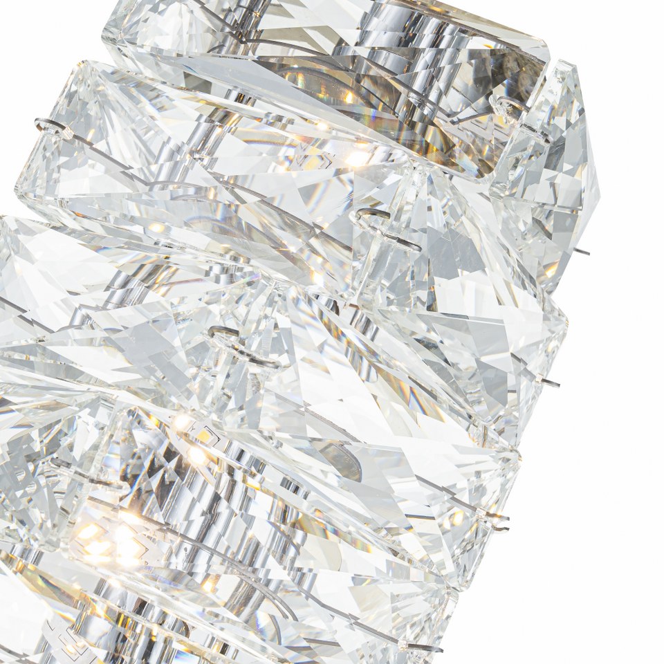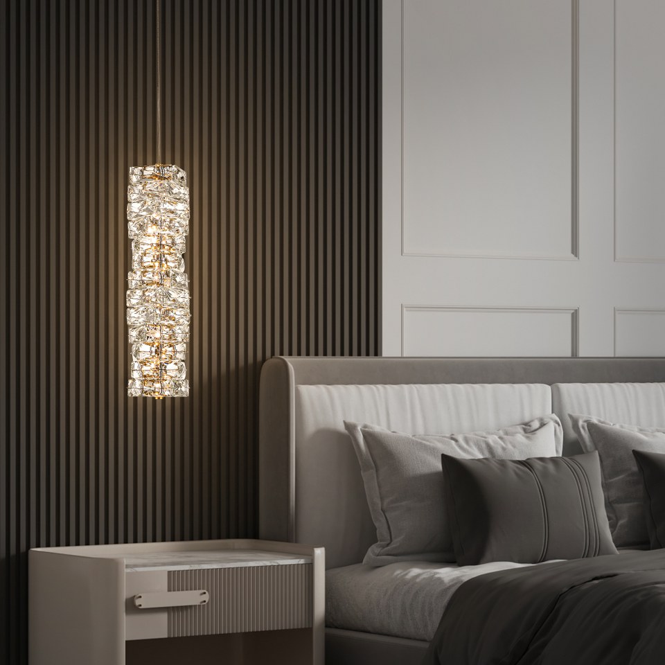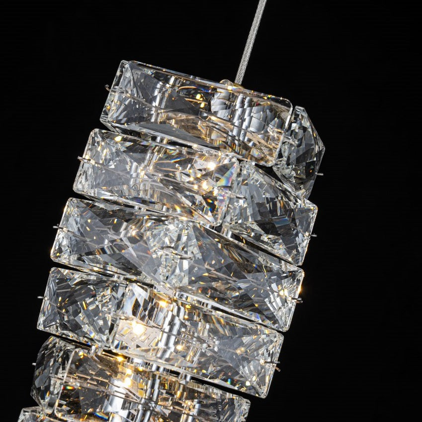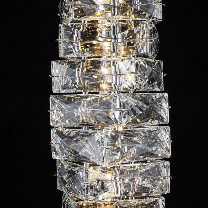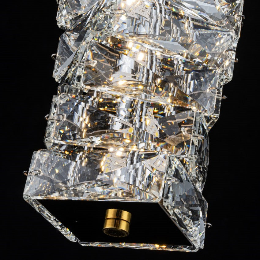 La lámpara LP124-1P está compuesta por múltiples piezas de cristal tallado de alta transparencia, dispuestas en una estructura cilíndrica vertical. Cada módulo de cristal genera un efecto visual deslumbrante al reflejar la luz LED integrada, creando destellos elegantes y modernos. La disposición en espiral potencia la refracción de la luz y da una sensación de volumen sofisticado.