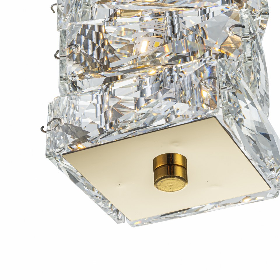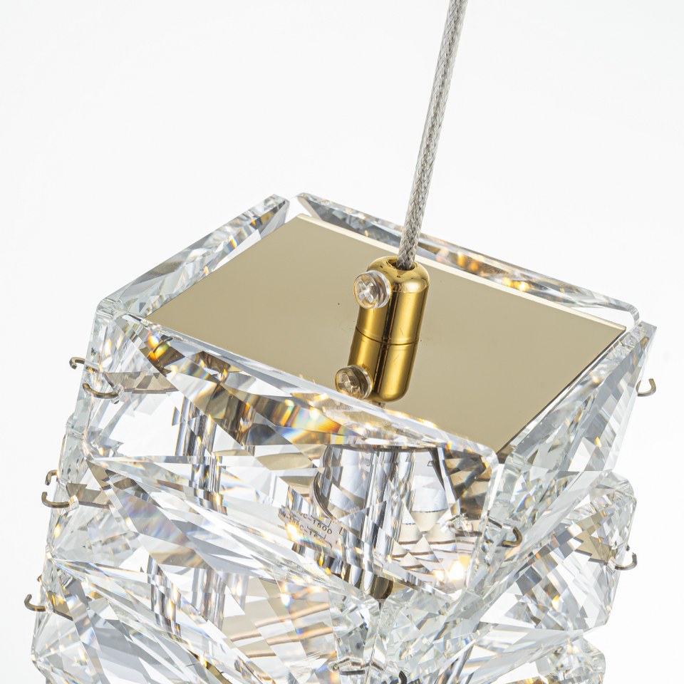 La estructura de la lámpara LP124-1P está fabricada en metal con acabado dorado brillante, que aporta un toque de lujo y sofisticación. El soporte superior que conecta con el cable de suspensión está cuidadosamente diseñado para integrarse de forma elegante con los módulos de cristal. Su construcción firme garantiza estabilidad, mientras que el acabado pulido refuerza la estética moderna y refinada del conjunto.