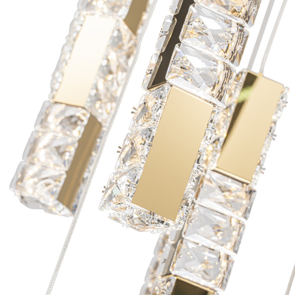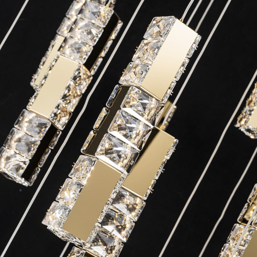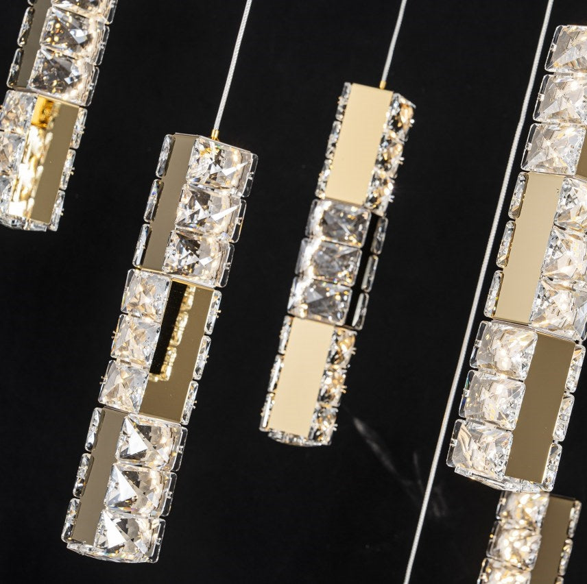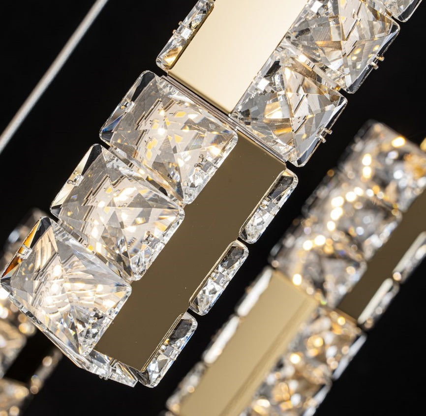 Cada módulo de esta lámpara incorpora cristales tallados de alta pureza, que destacan por su transparencia y la forma precisa de corte tipo diamante. Estos cristales reflejan la luz con un efecto deslumbrante, creando destellos cálidos y elegantes.