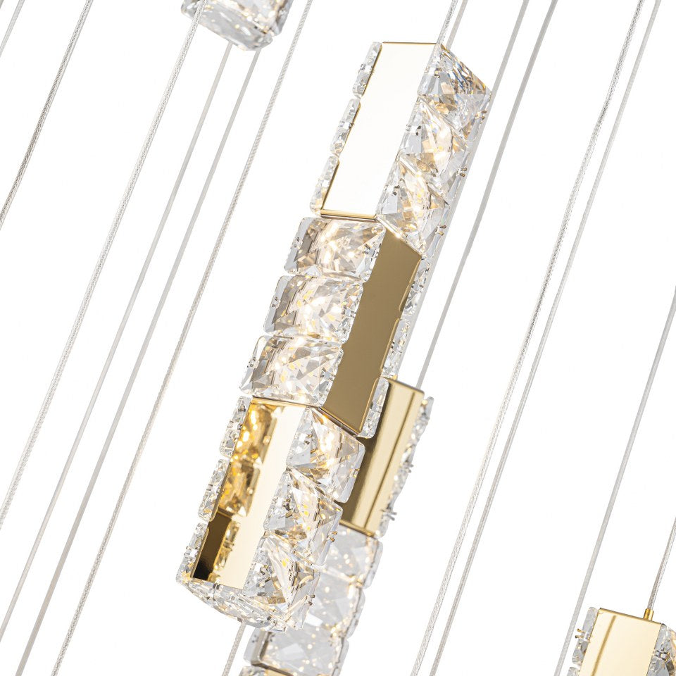Déjate cautivar por la sofisticación de esta lámpara colgante con 18 luces LED integradas, regulables en temperatura de color (3000K-6000K) e intensidad. Su diseño en cascada, con acabado dorado y cristal facetado, es ideal para escaleras, entradas o espacios de techos altos, creando una atmósfera cálida y moderna.