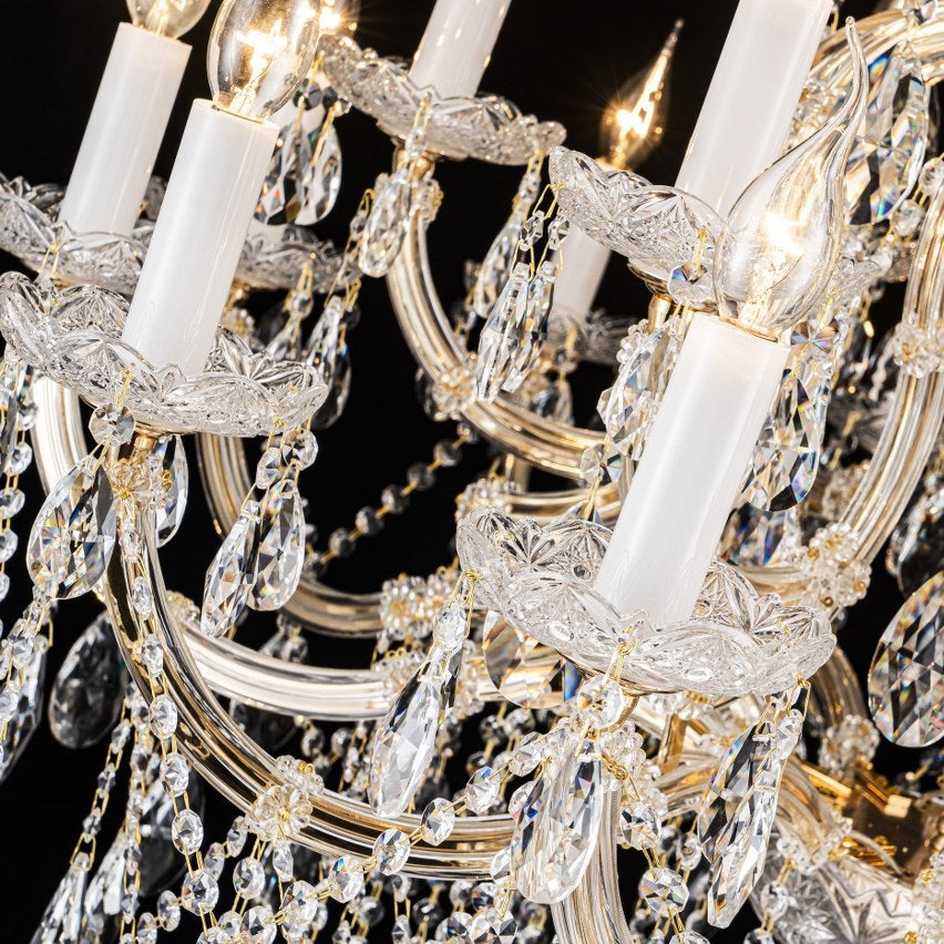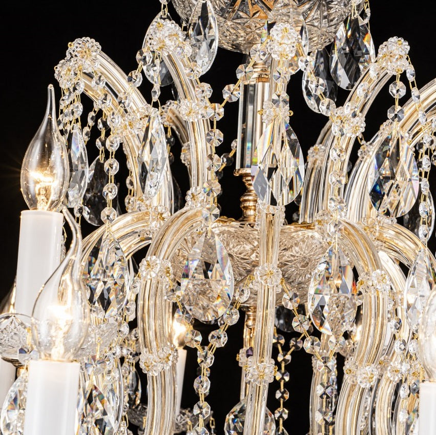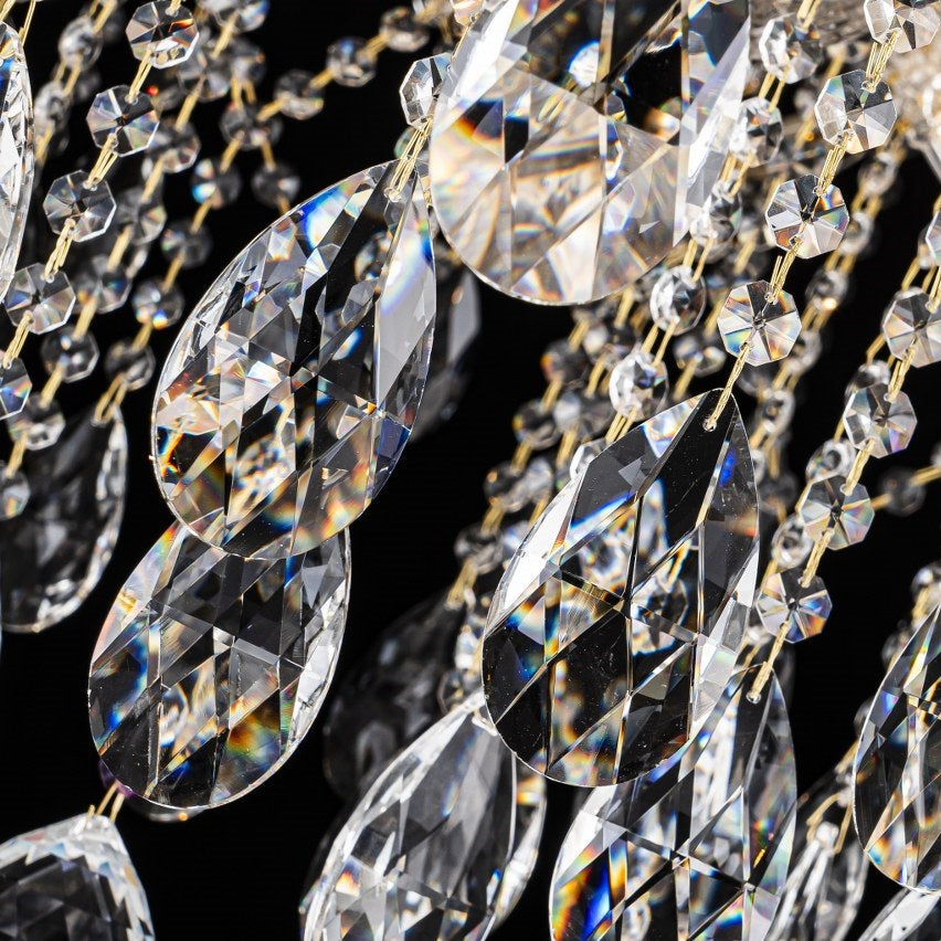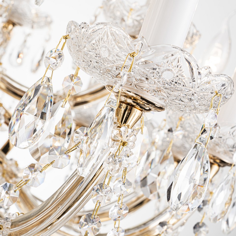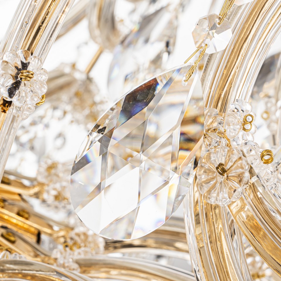 La estructura está fabricada en metal con un acabado dorado brillante, aportando calidez y elegancia al conjunto. Los brazos curvados de vidrio y los detalles florales en cristal complementan la riqueza del diseño, creando un efecto visual clásico y refinado.