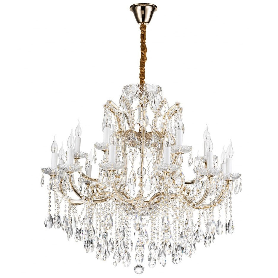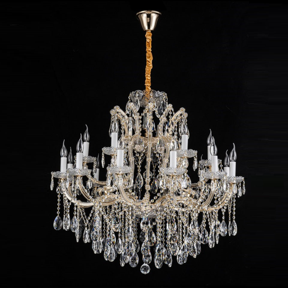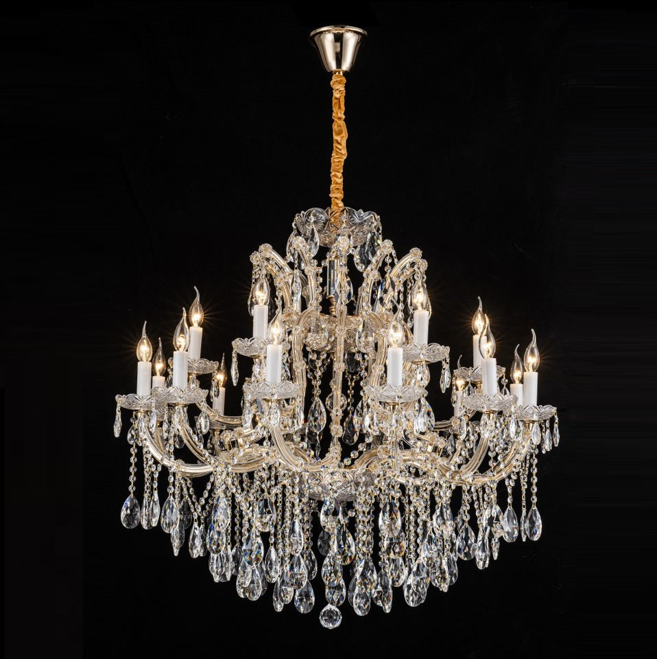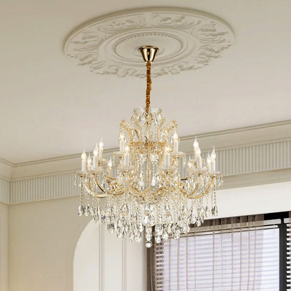 Este modelo de araña aporta un toque majestuoso y tradicional a cualquier espacio. Su estructura de vidrio transparente con detalles dorados resalta el brillo de las cadenas y gotas de cristal, creando una pieza decorativa sofisticada y luminosa. Perfecta para comedores, salones o estancias de estilo clásico.