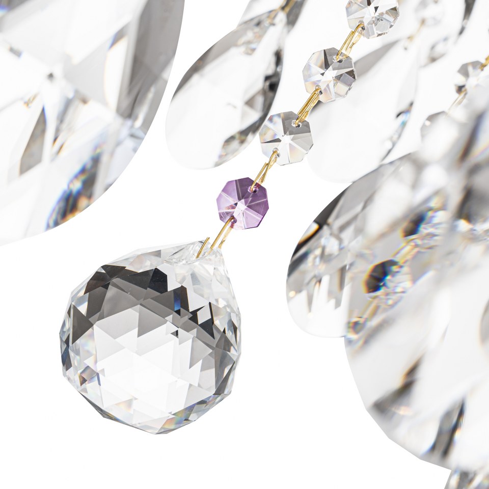 Este diseño incorpora lágrimas facetadas de cristal K9, conocidas por su claridad y reflejo. Cada pieza está tallada con precisión para maximizar el brillo, y el detalle en tonos amatista añade un toque exclusivo y sofisticado.