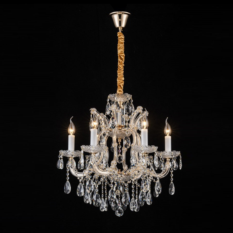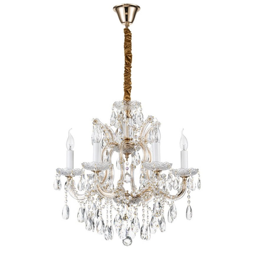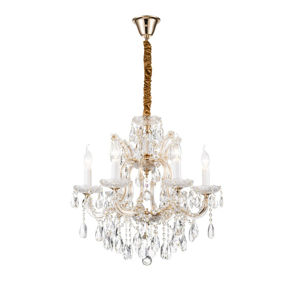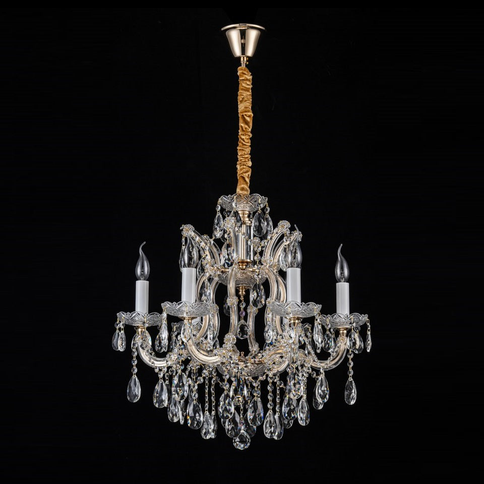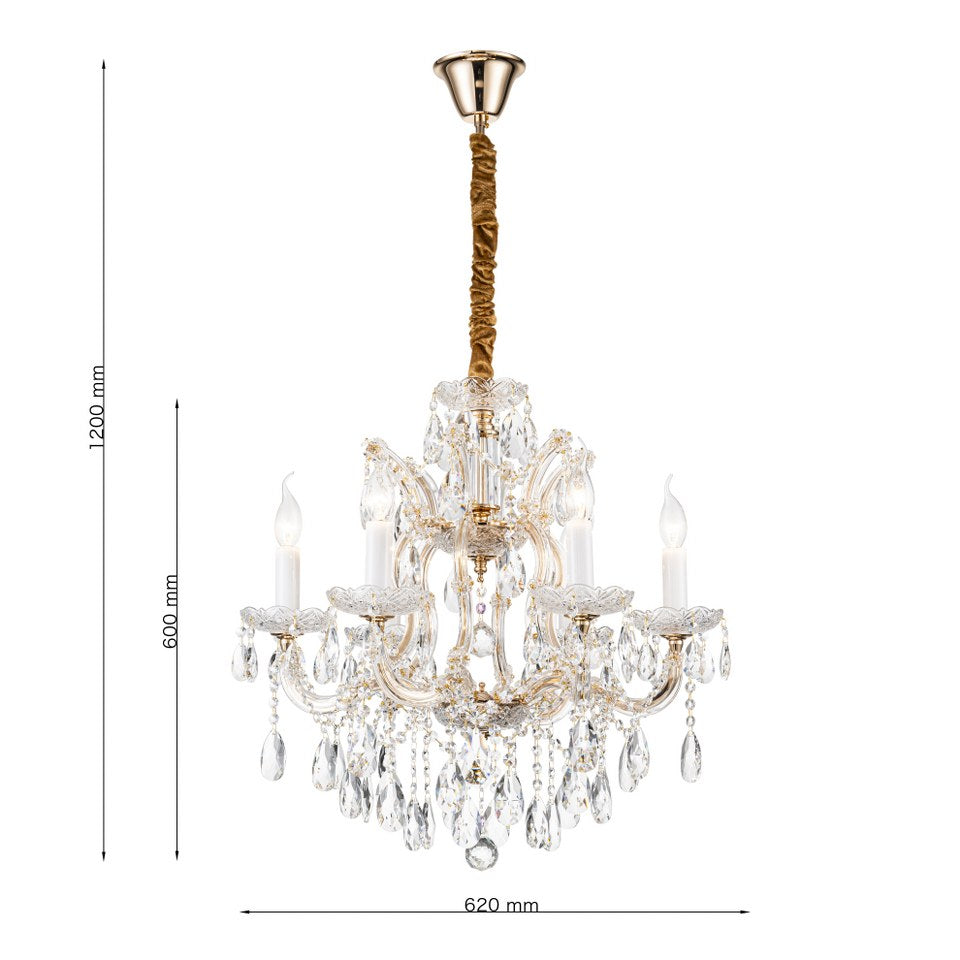 Esta lámpara de araña combina la elegancia del cristal con una estructura en cálido dorado, creando un ambiente sofisticado y acogedor. Perfecta para comedores o salones con un estilo clásico o vintage. Sus líneas suaves y detalles decorativos añaden un encanto atemporal a cualquier espacio.