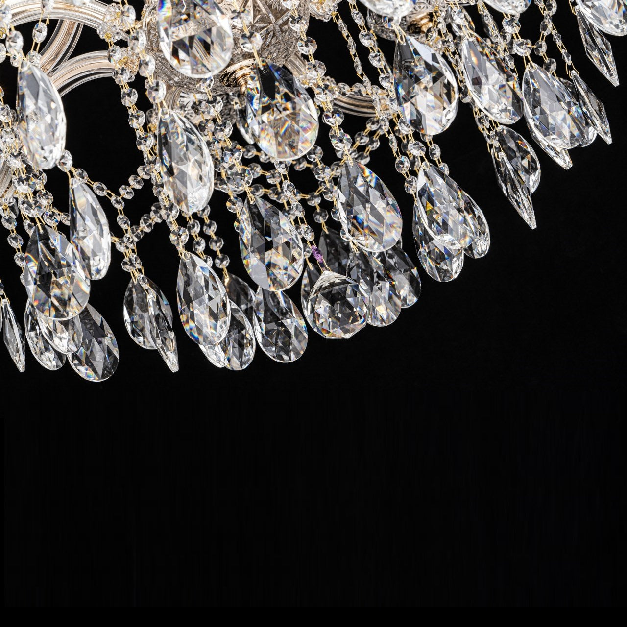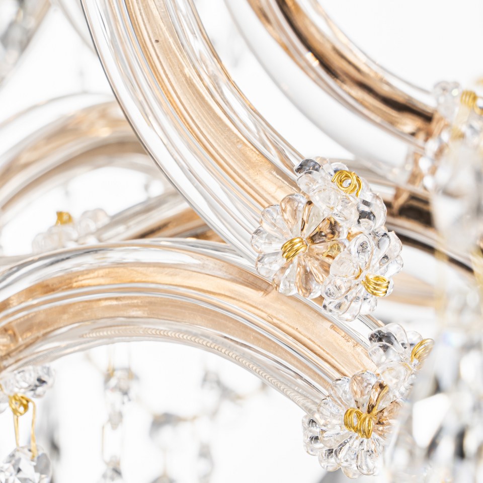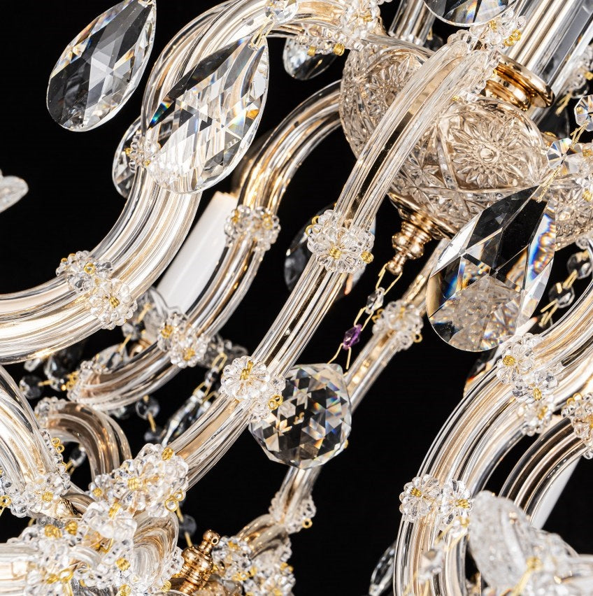 El diseño se enriquece con lágrimas facetadas de cristal K9, conocido por su transparencia y capacidad de reflejar la luz con un efecto brillante.