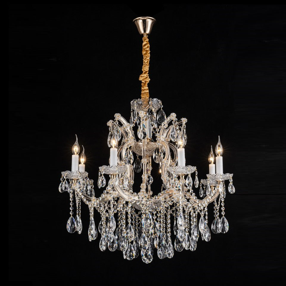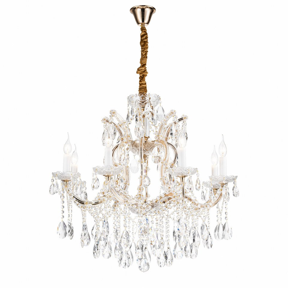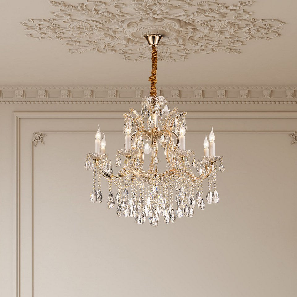 Esta lámpara de araña eleva la elegancia tradicional con un acabado dorado y formas armoniosas. Ideal para estancias con detalles arquitectónicos clásicos, su diseño aporta un aire refinado sin sobrecargar el espacio. La estructura y los cristales se integran con equilibrio, creando un punto focal sofisticado.