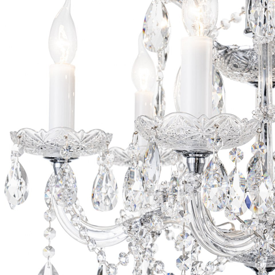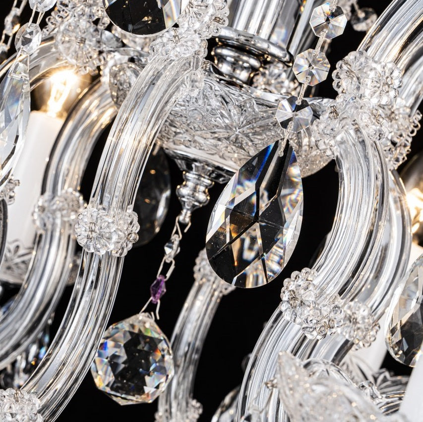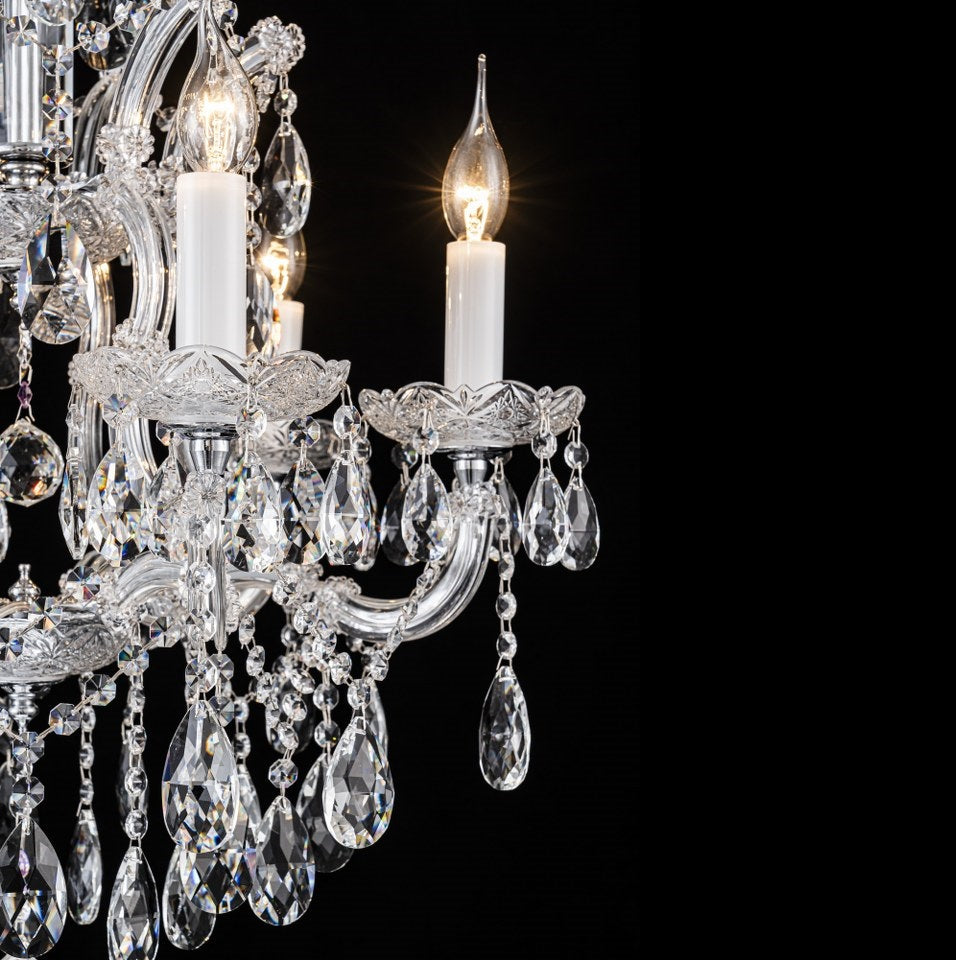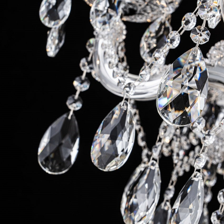El cuerpo combina brazos de cristal moldeado con detalles metálicos cromados, aportando resistencia y un acabado brillante que complementa a la perfección el juego de cristales. Una fusión de materiales que garantiza durabilidad y estilo clásico.