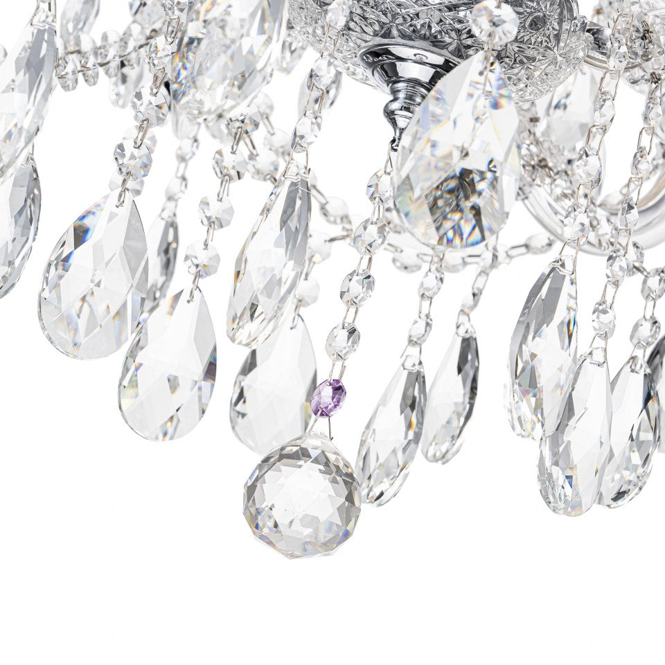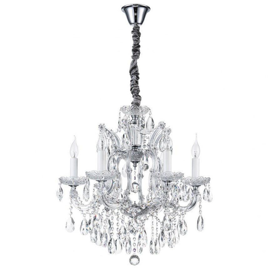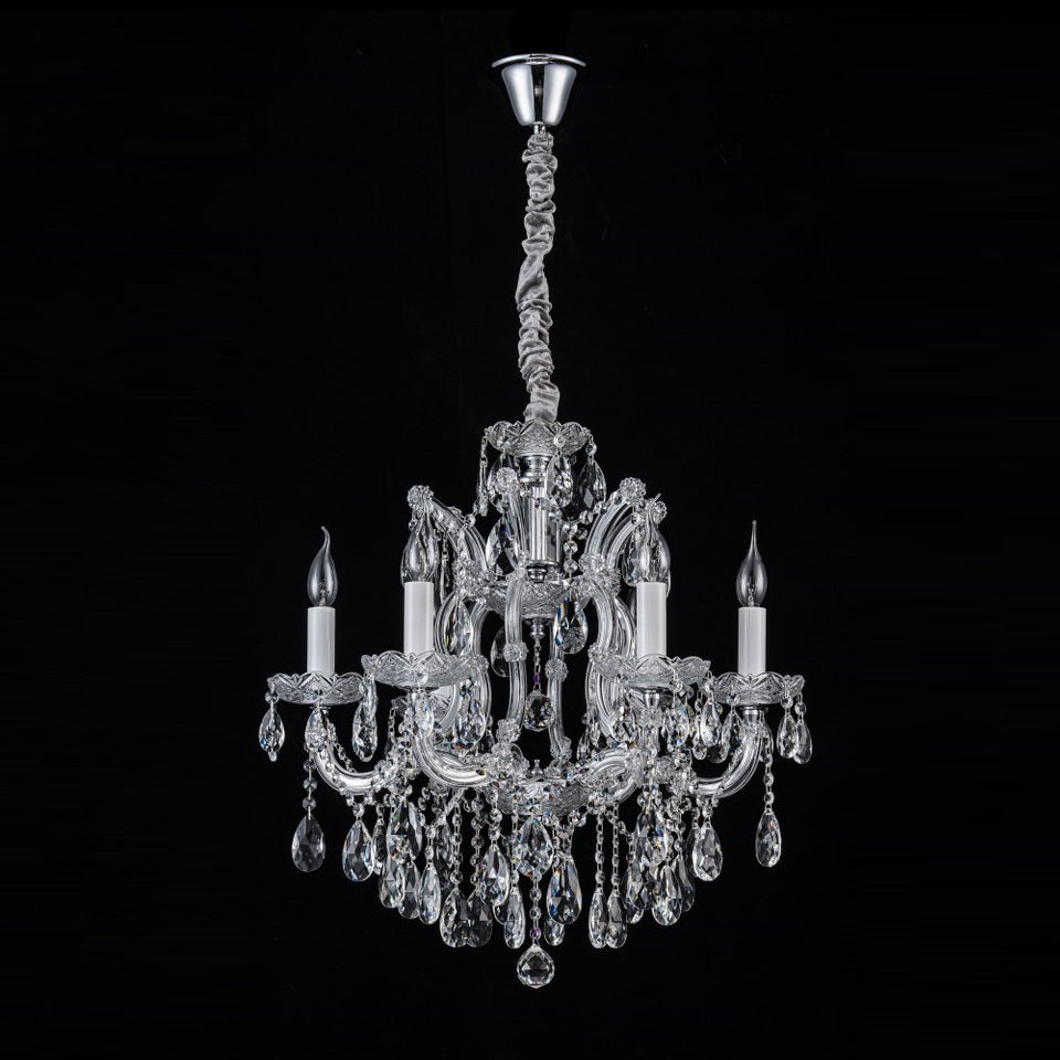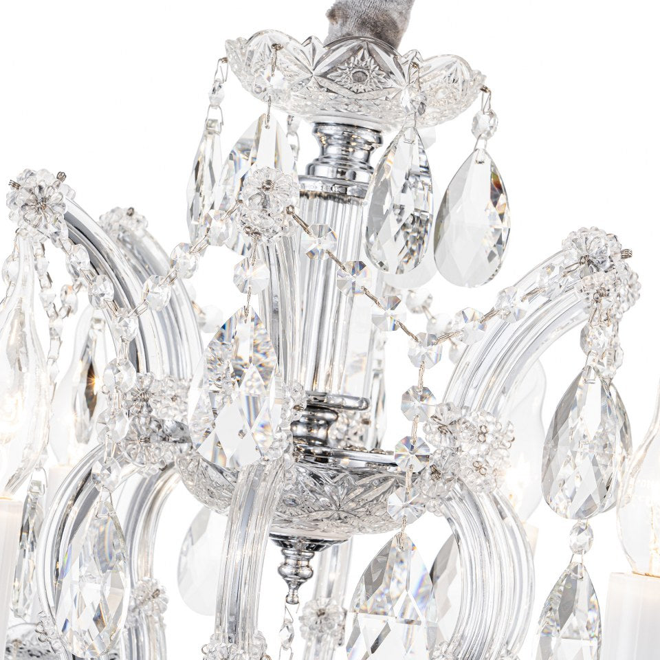El cuerpo combina brazos de cristal moldeado con detalles metálicos cromados, aportando resistencia y un acabado brillante que complementa a la perfección el juego de cristales. Una fusión de materiales que garantiza durabilidad y estilo clásico.