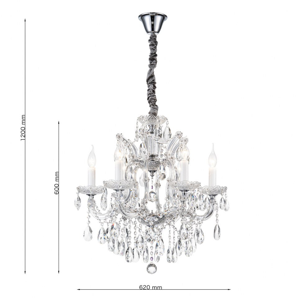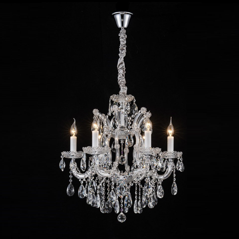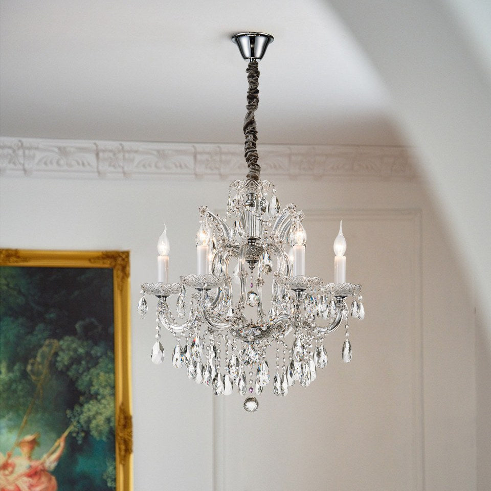 Este modelo de araña de cristal aporta un toque refinado y majestuoso a cualquier estancia. Su diseño simétrico con seis brazos y detalles colgantes logra un equilibrio perfecto entre clasicismo y luminosidad. Ideal para salones o recibidores con carácter.