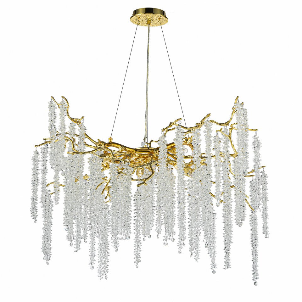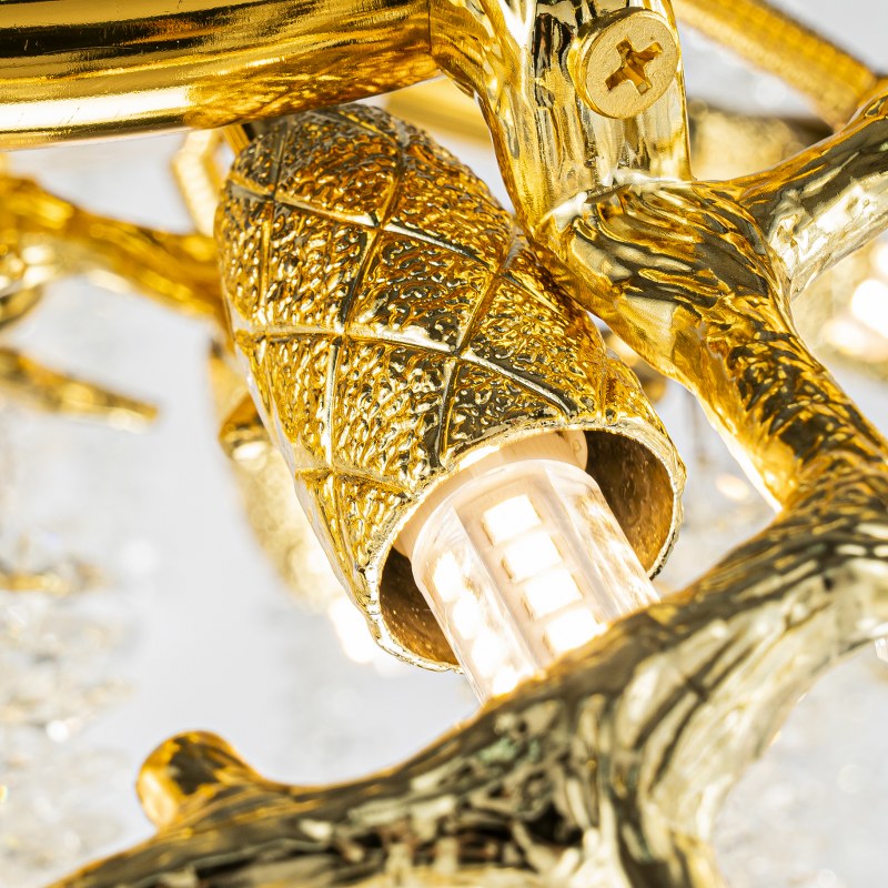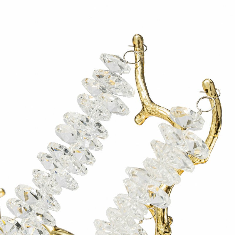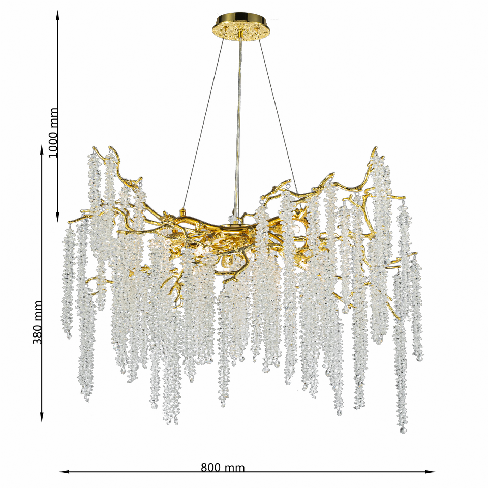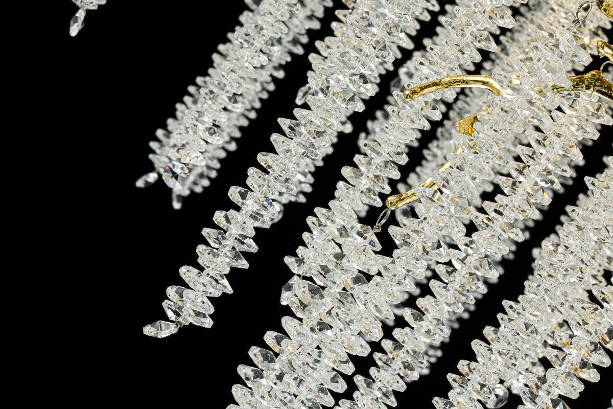 Esta lámpara compacta combina la calidez del acabado dorado con el brillo puro del cristal K9. Una pieza que transforma cualquier salón o comedor en un entorno sofisticado y luminoso.