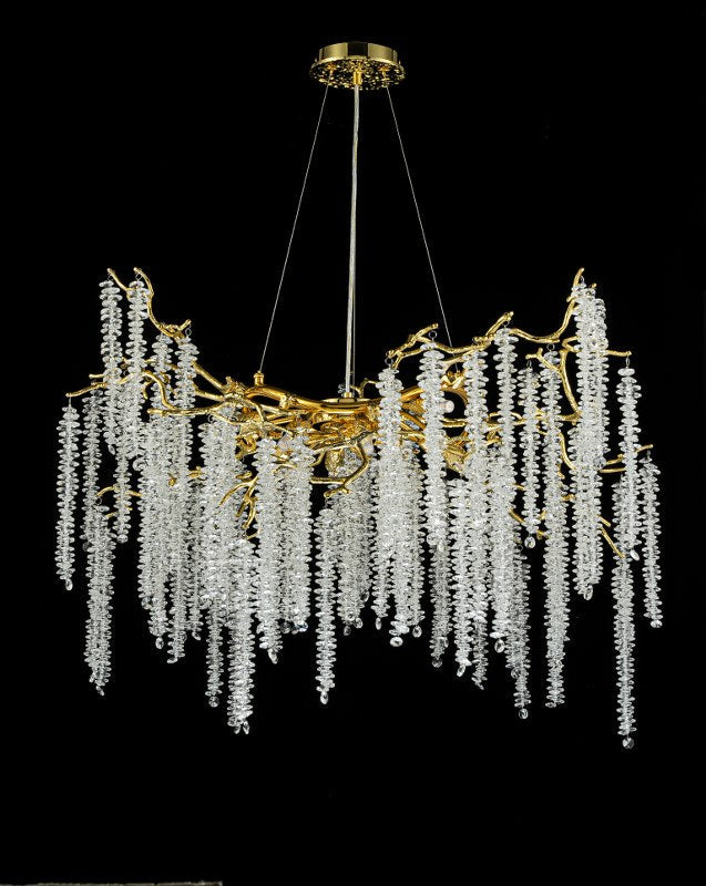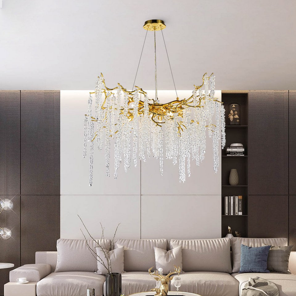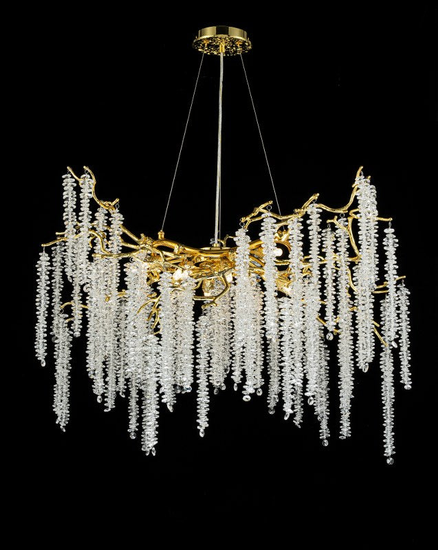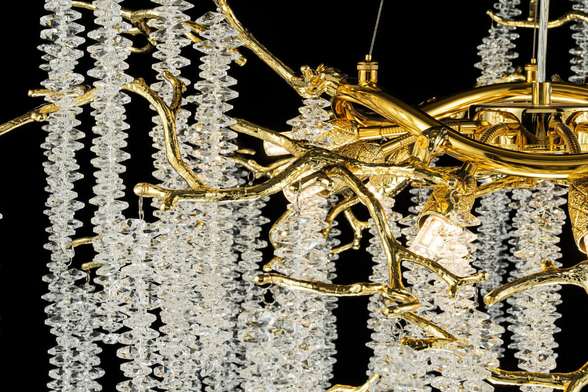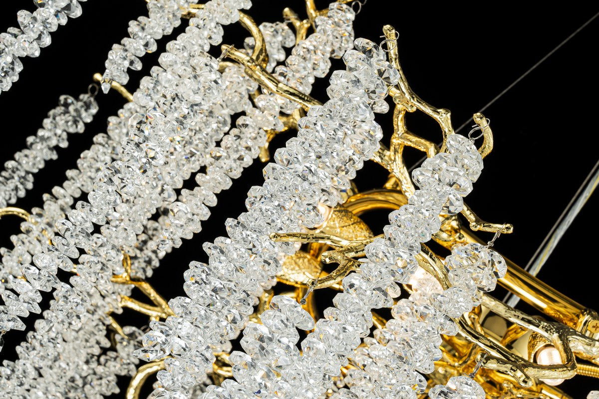 Esta lámpara compacta combina la calidez del acabado dorado con el brillo puro del cristal K9. Una pieza que transforma cualquier salón o comedor en un entorno sofisticado y luminoso.