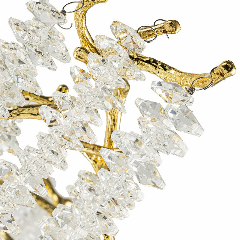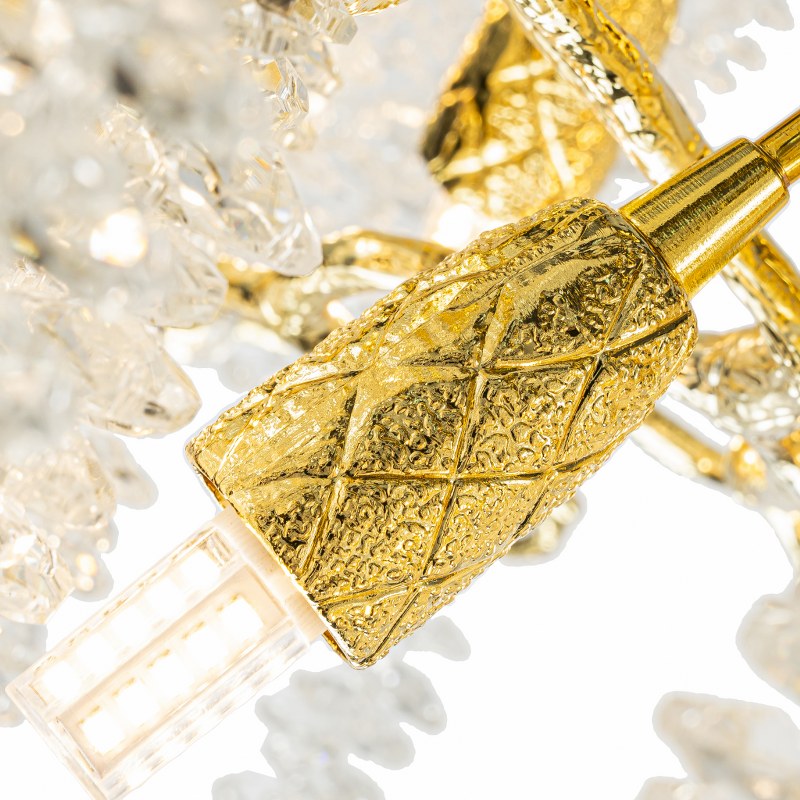 Cada pieza de cristal K9 se ensambla meticulosamente para generar una caída armónica que refleja la luz desde todos los ángulos. El complemento ideal para una estructura dorada de alto impacto visual.