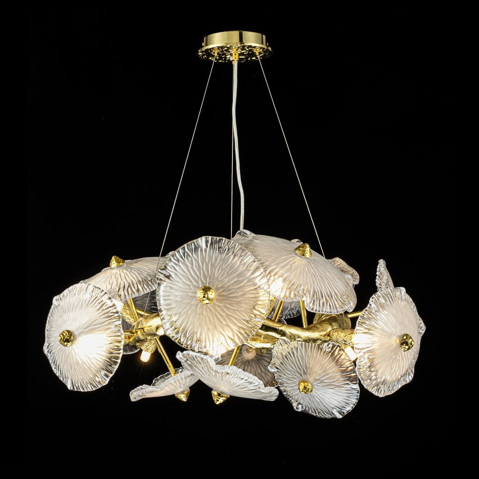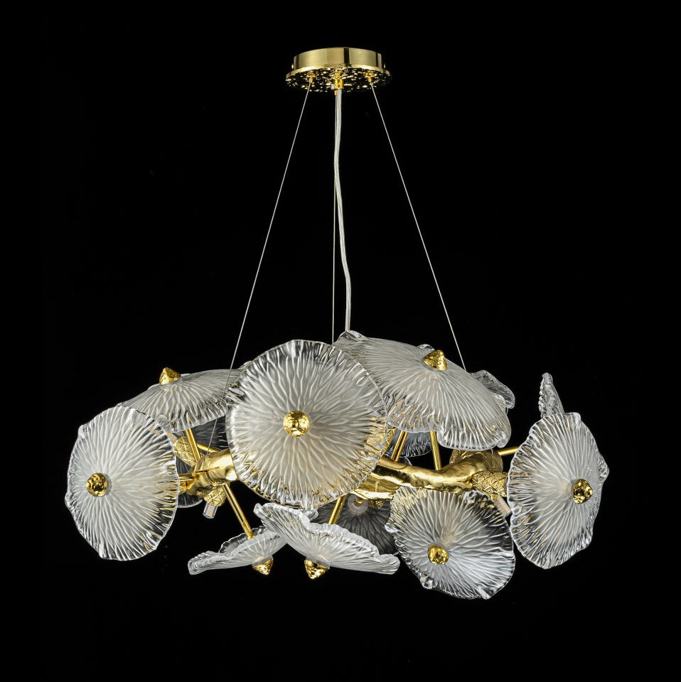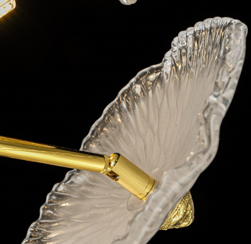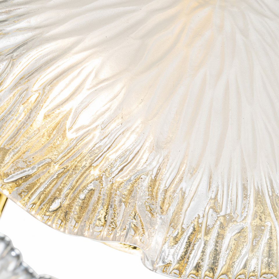 Cada pieza de cristal ha sido moldeada con precisión y cuidado, creando una textura orgánica que difumina la luz de forma suave y elegante. Su acabado semitranslúcido con detalles dorados añade un efecto visual único, convirtiendo la lámpara en una verdadera obra decorativa.