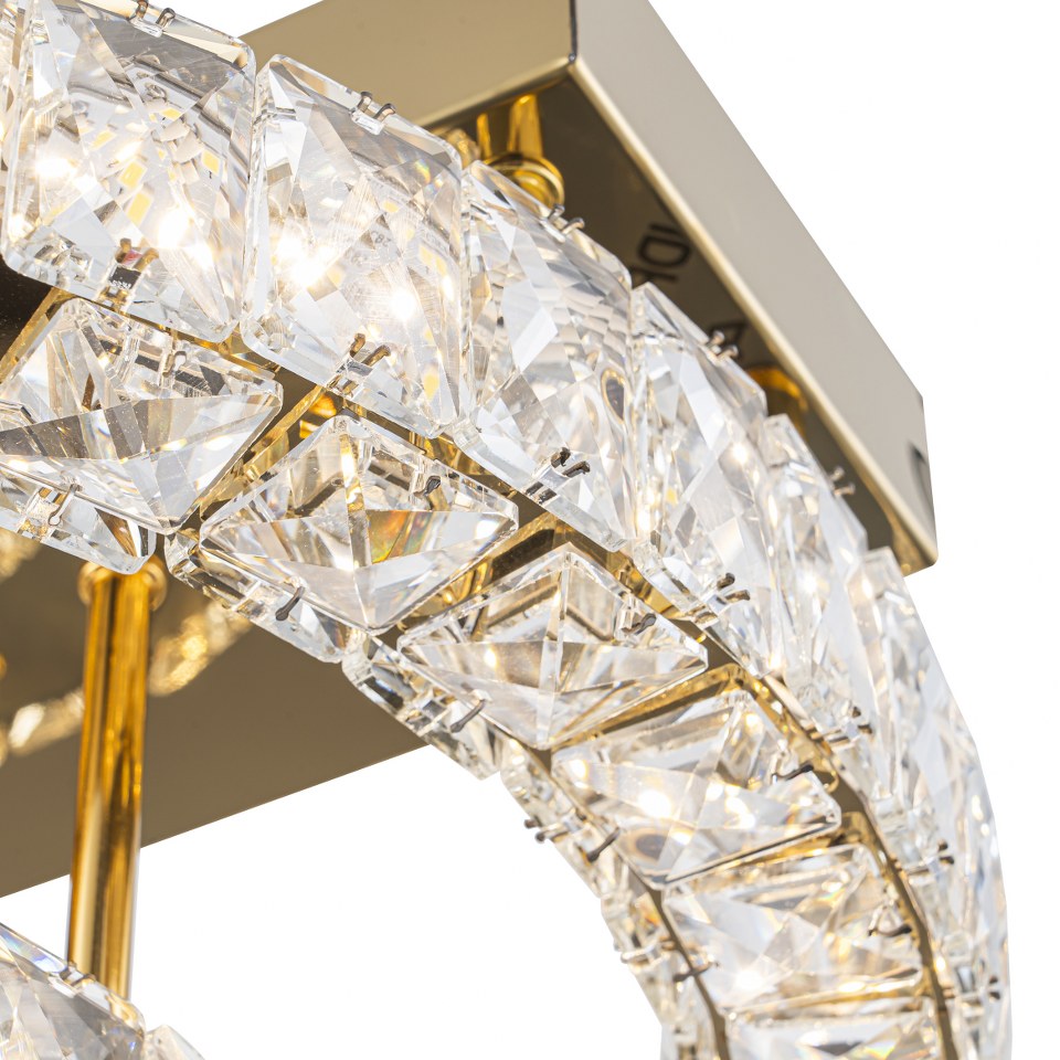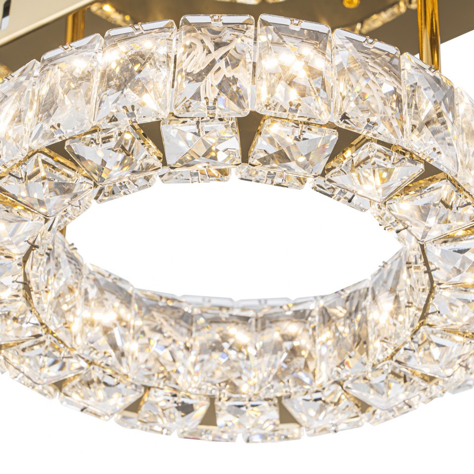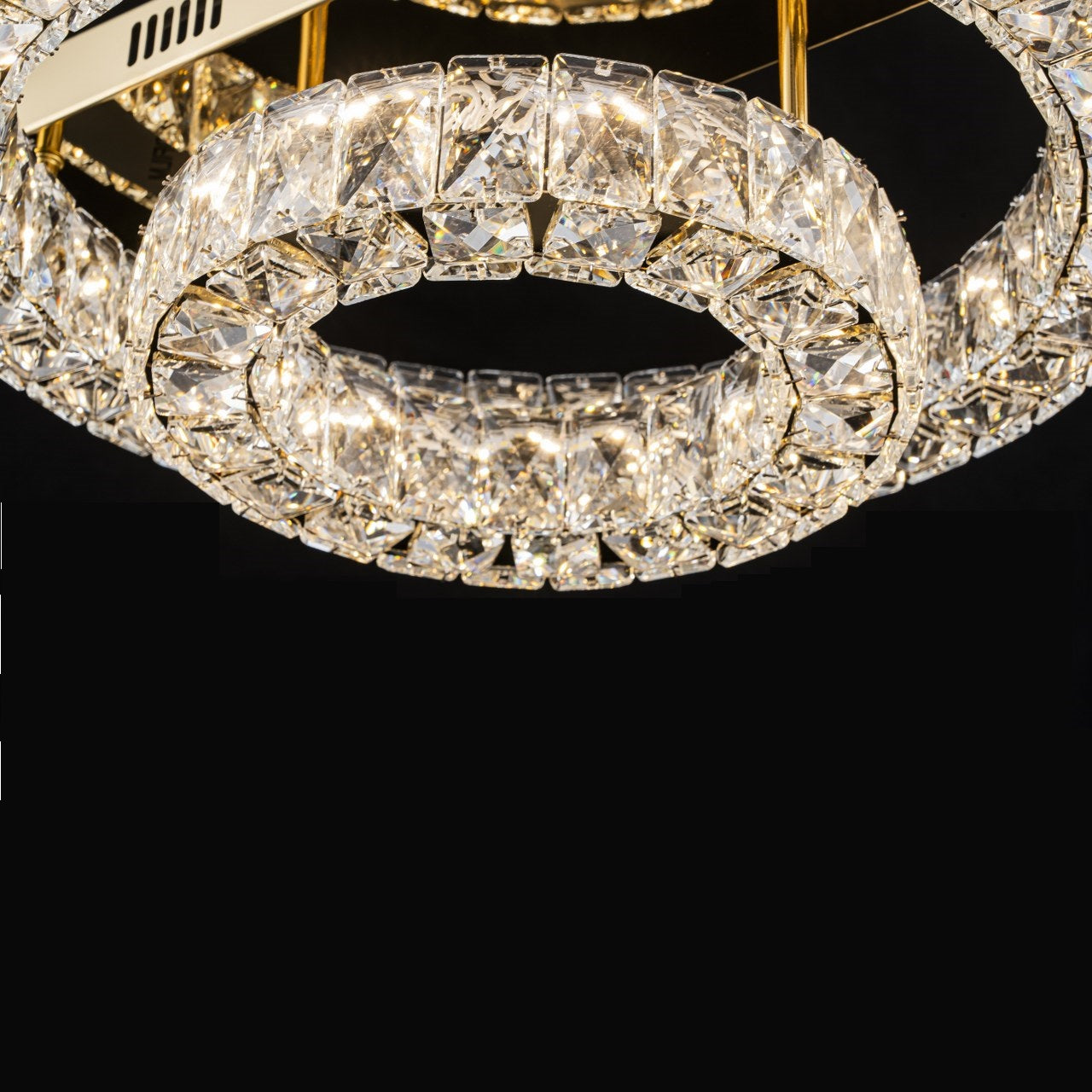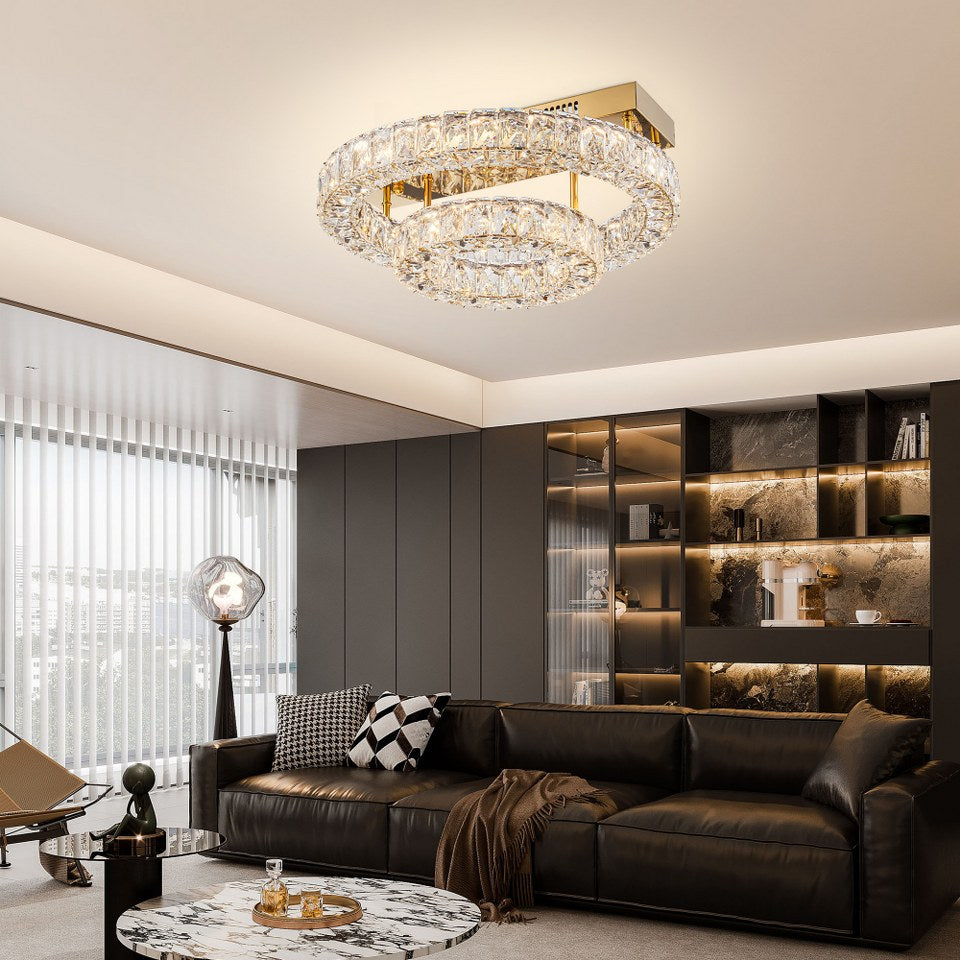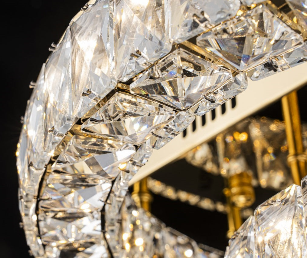 Cada aro está revestido con cristal facetado de alta pureza, cortado con precisión para maximizar la refracción de la luz ✨. El efecto visual es simplemente hipnótico: destellos y reflejos que cambian sutilmente según el ángulo de visión. Una pieza de diseño que no solo ilumina, sino que embellece tu hogar con un toque de lujo atemporal.