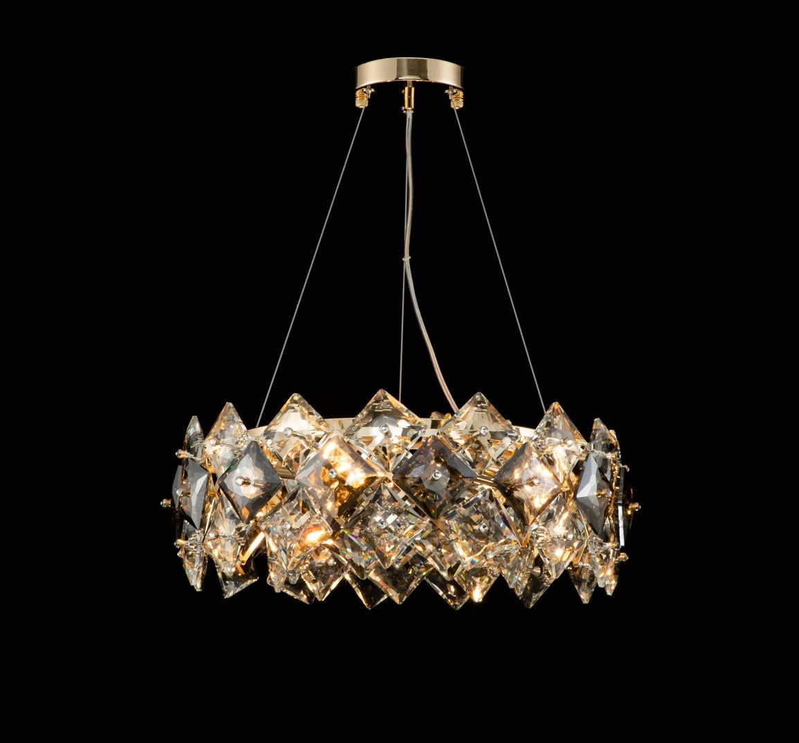 Esta luminaria circular combina la pureza del cristal K9 con un diseño tridimensional envolvente. Ideal para comedores, recibidores o salones con estilo, su estructura suspendida destaca por su volumen visual y sus reflejos cálidos y vibrantes.