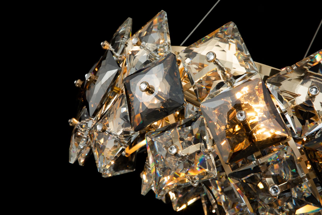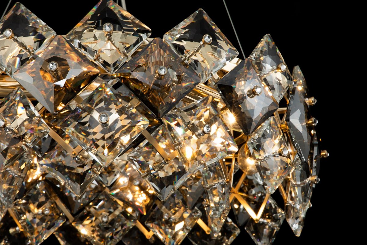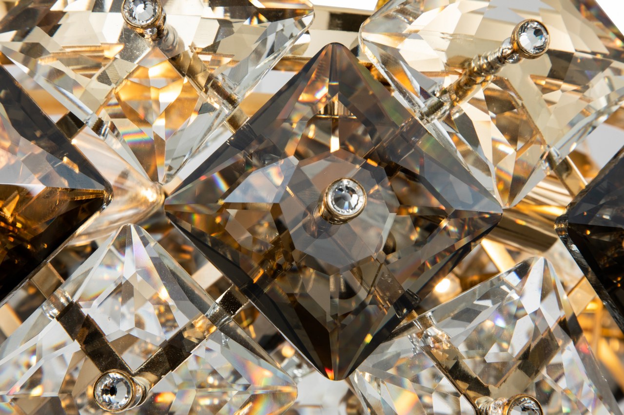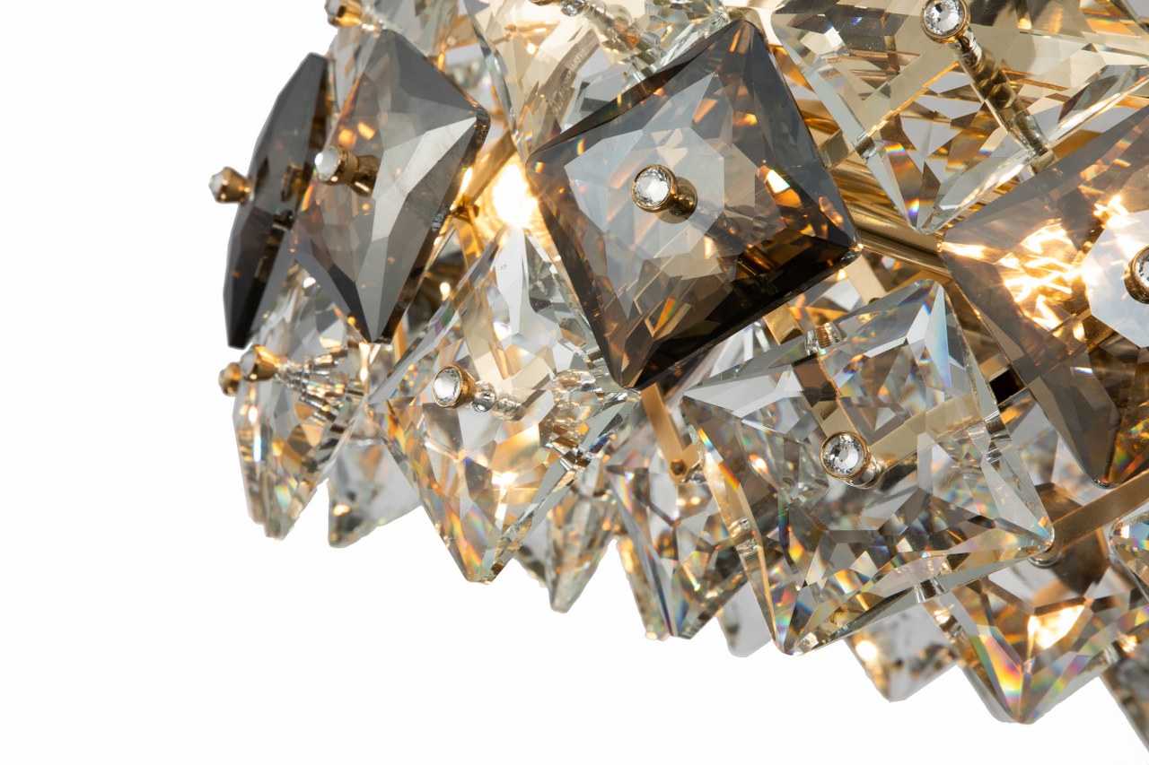 La estructura está compuesta por módulos de cristal K9 dispuestos en relieve, alternando tonos transparentes y ahumados. Cada pieza facetada actúa como un prisma, dispersando la luz con intensidad y creando un efecto visual vibrante y elegante.