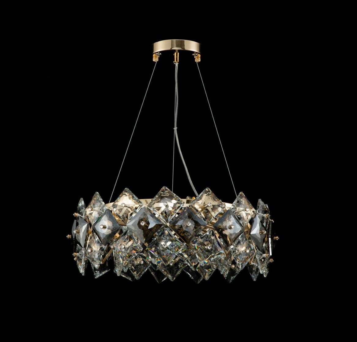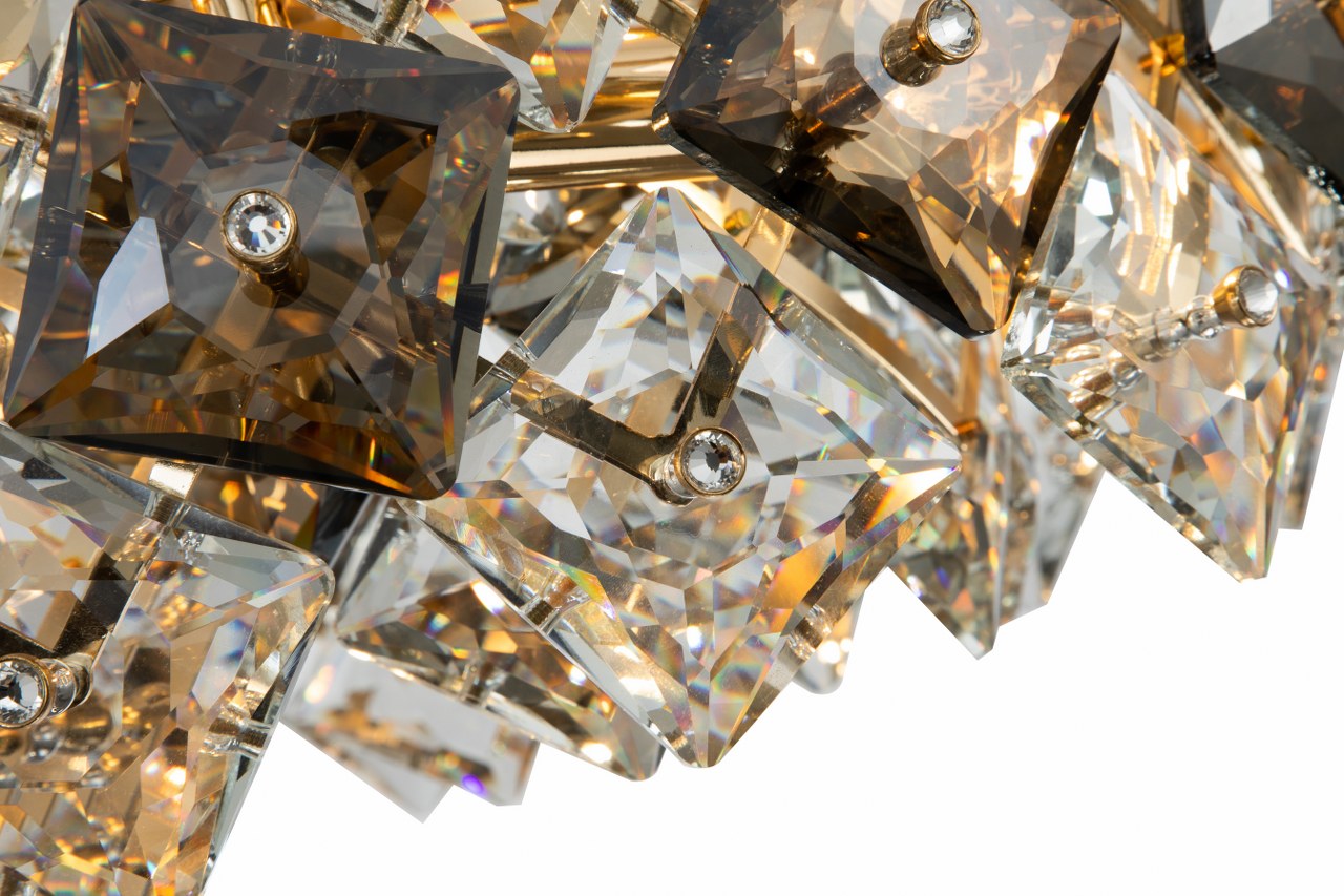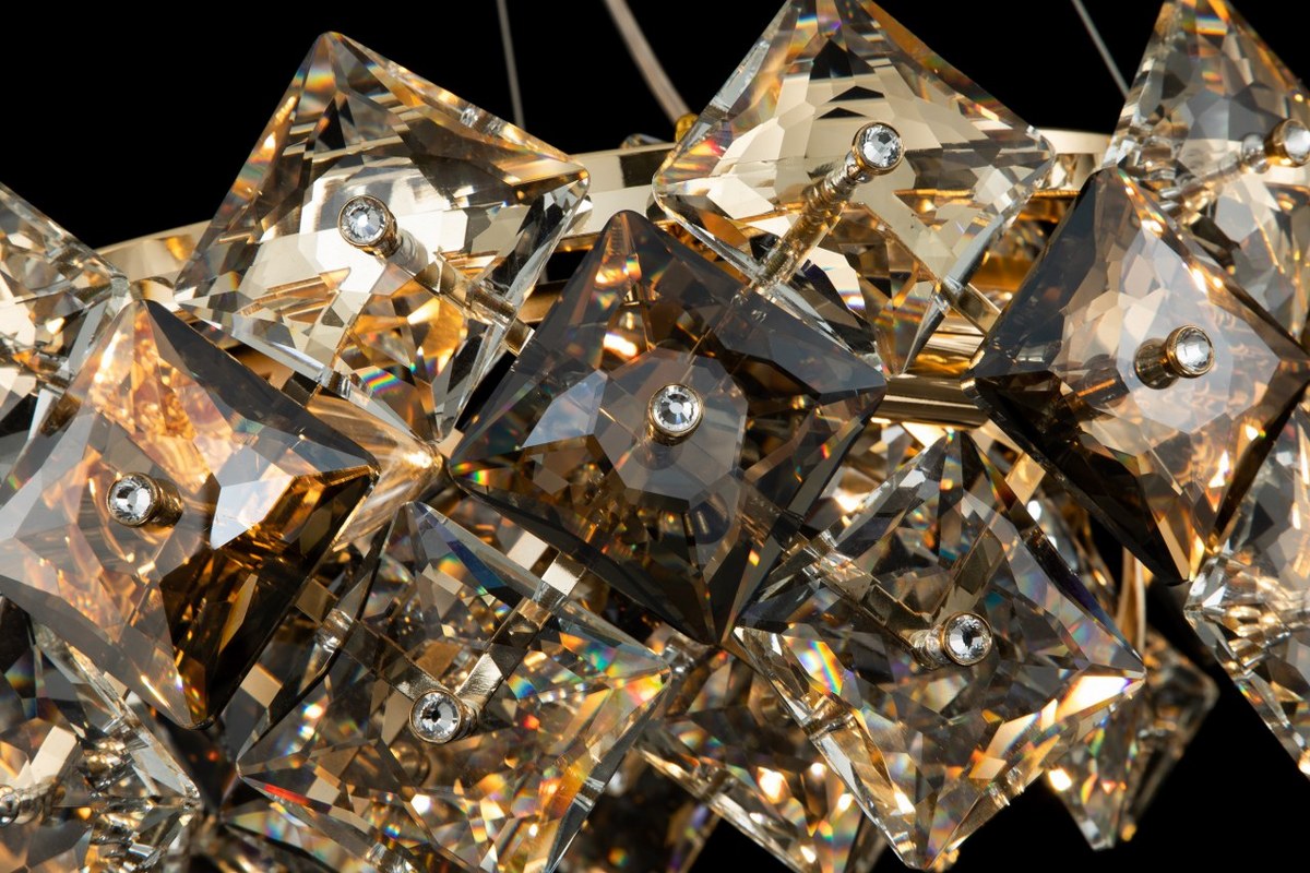 La estructura está compuesta por módulos de cristal K9 dispuestos en relieve, alternando tonos transparentes y ahumados. Cada pieza facetada actúa como un prisma, dispersando la luz con intensidad y creando un efecto visual vibrante y elegante.