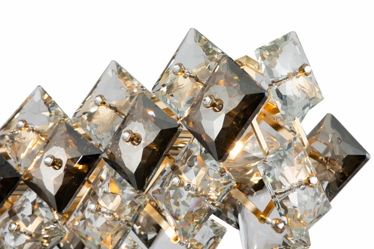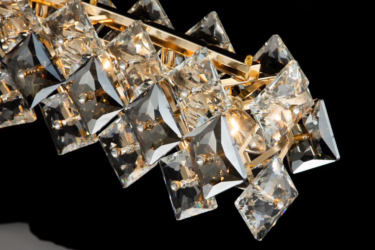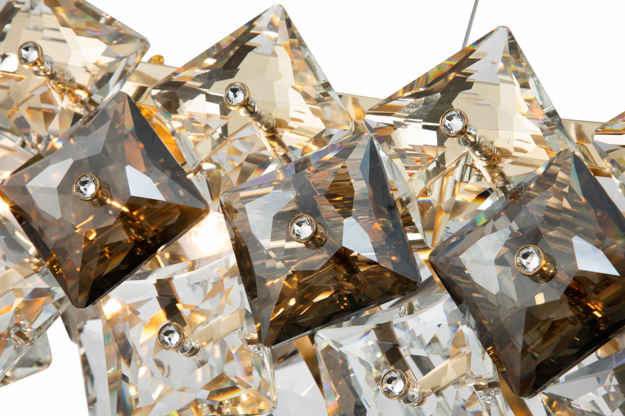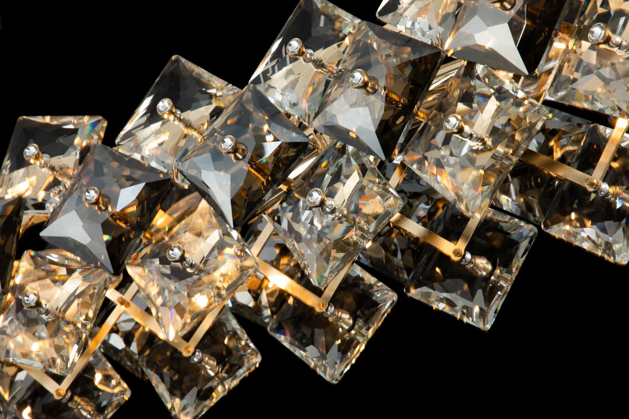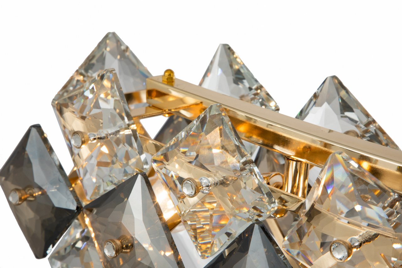 Cada módulo está compuesto por piezas de cristal K9 en tonos ahumado y transparente, talladas con precisión en forma de pirámide. El montaje en capas y el detalle central tipo gema crean una apariencia escultural que brilla desde cualquier ángulo.