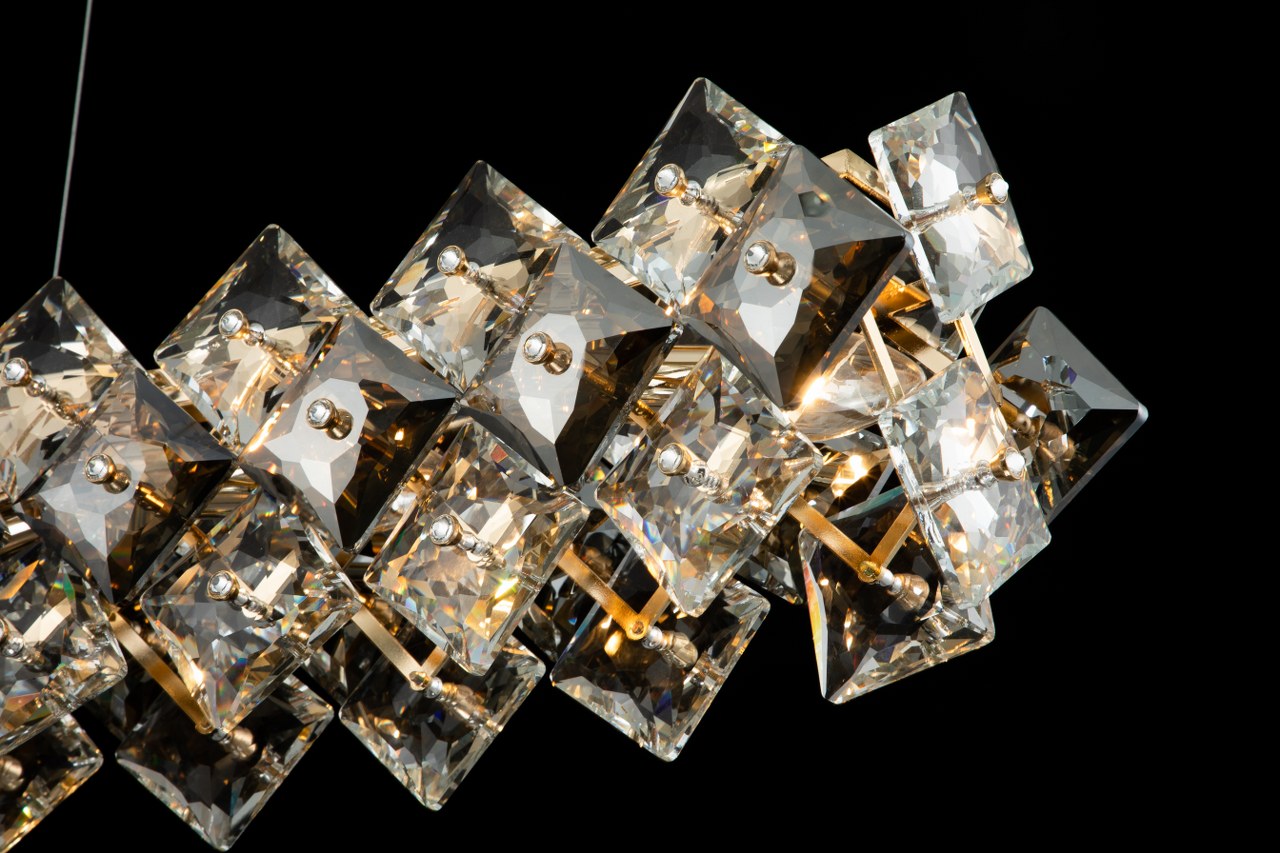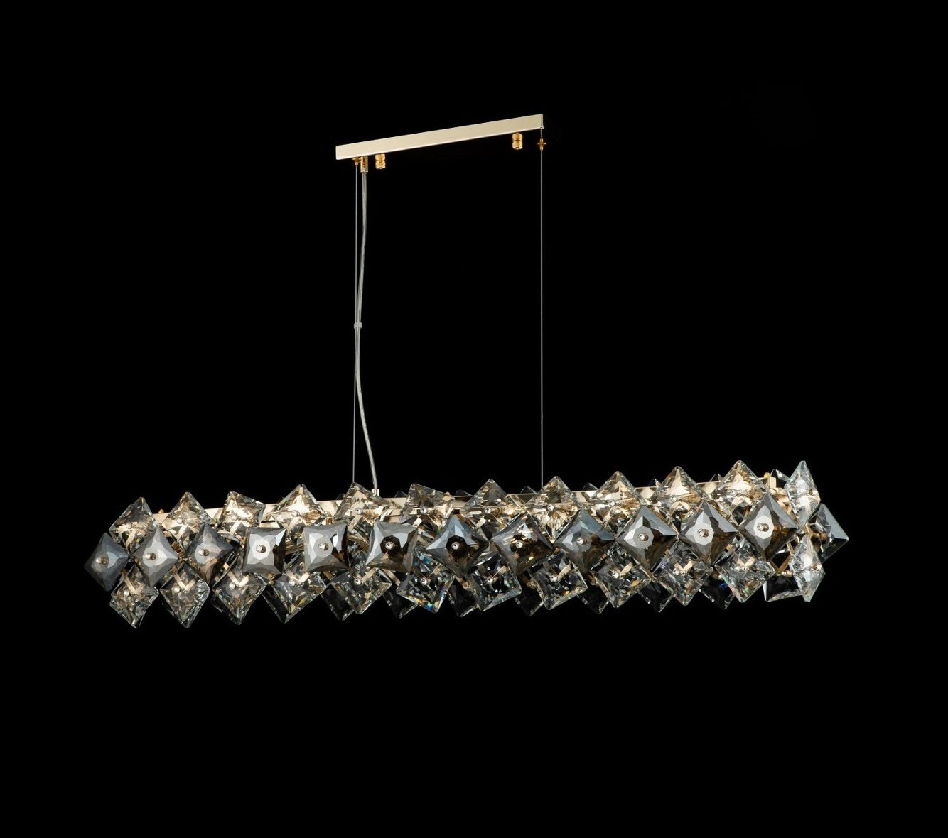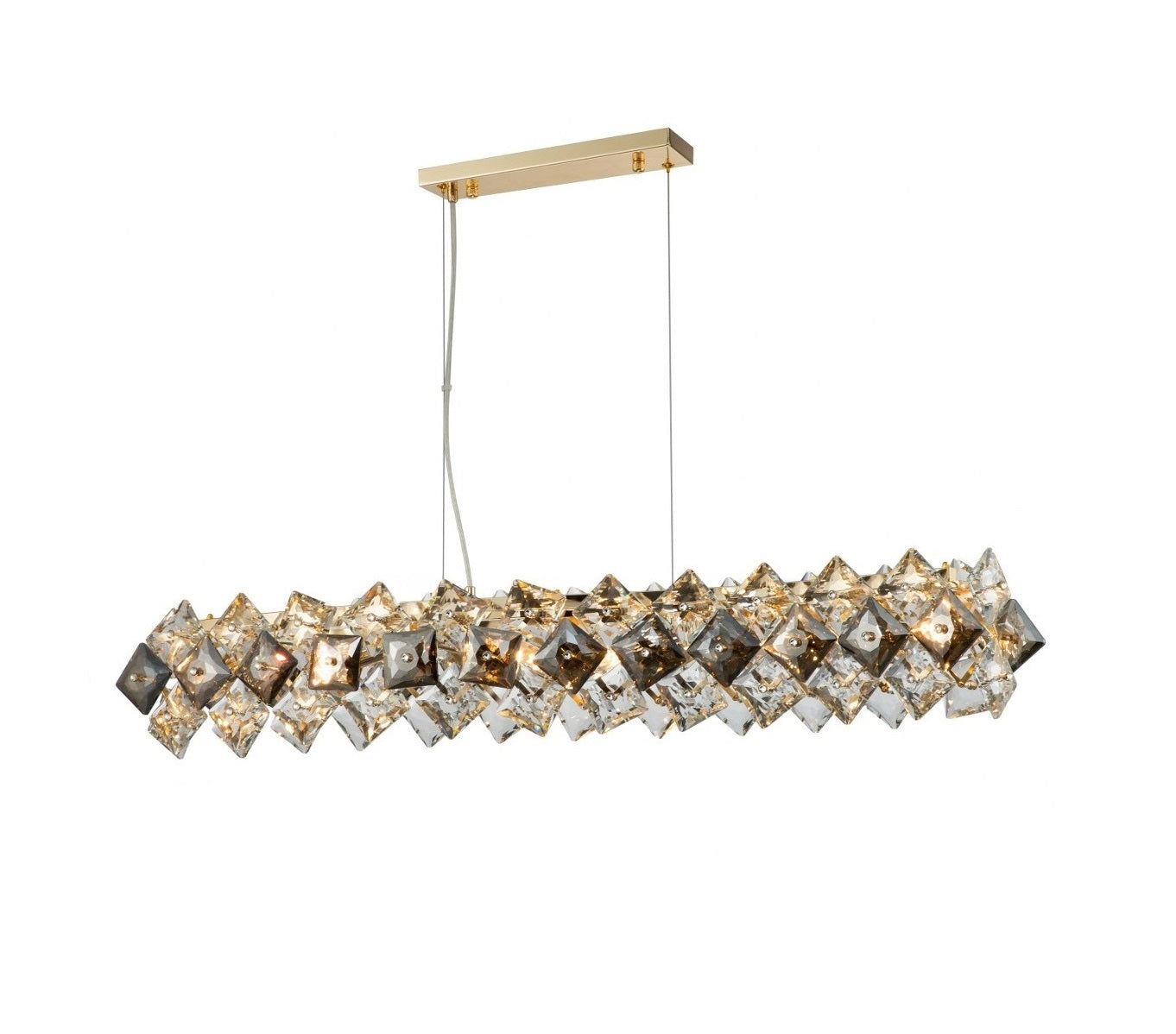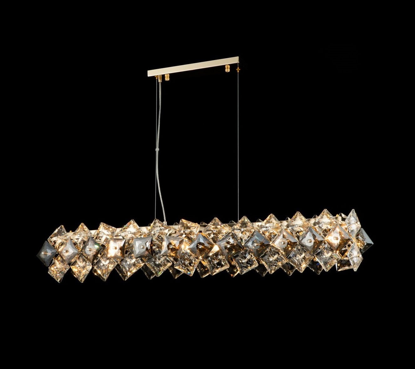 Esta luminaria rectangular combina módulos de cristal con estructura dorada en una composición de gran presencia. Ideal para instalar sobre mesas de comedor o islas de cocina, su diseño geométrico crea un efecto escultural que ilumina con elegancia sin perder modernidad.